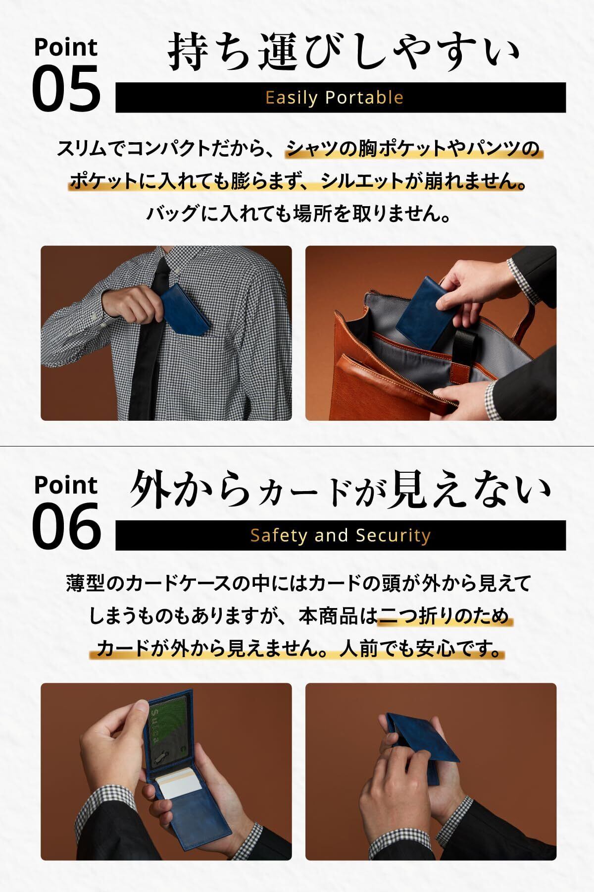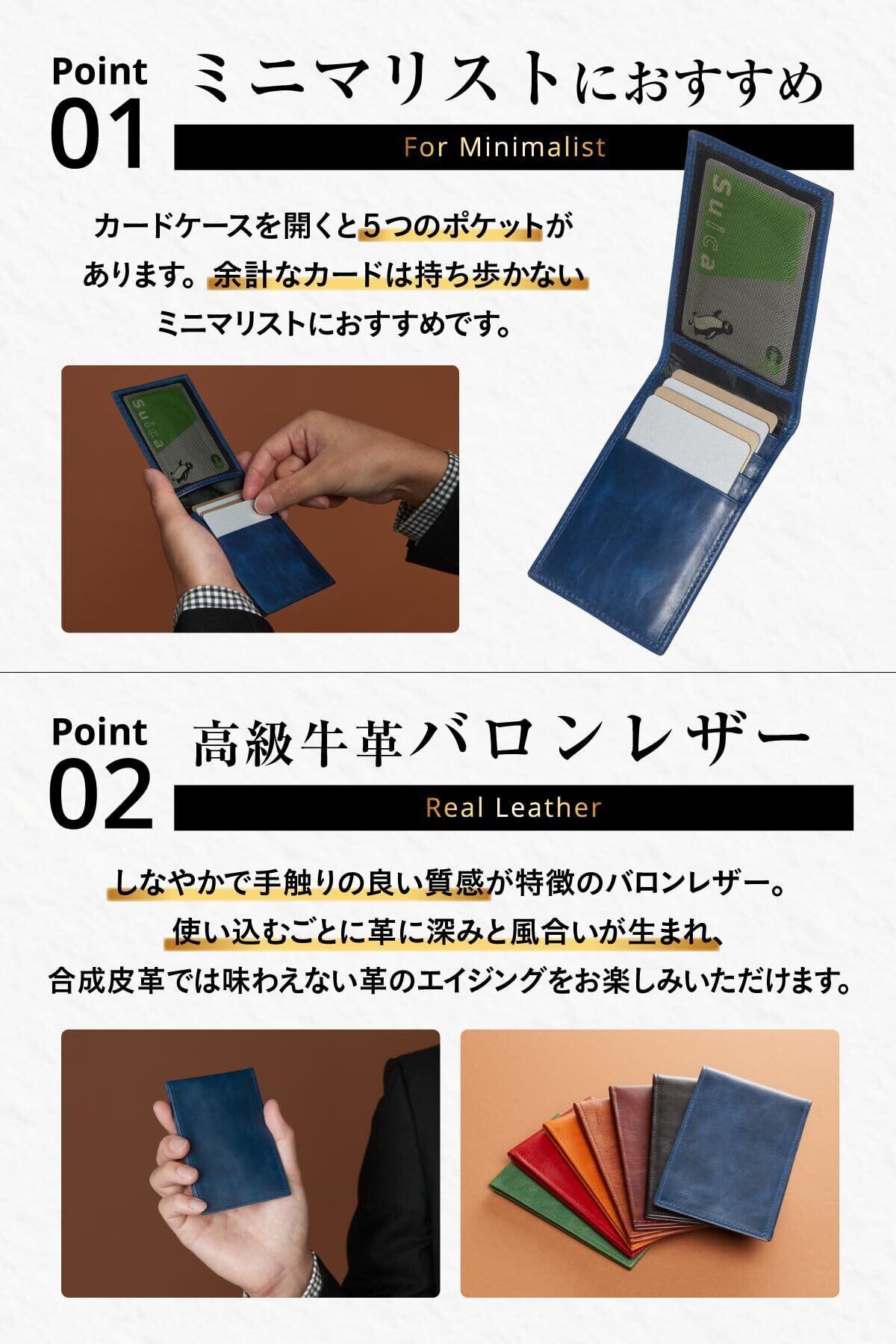【外からカードが見えない安心感】薄型のカードケースの中にはカードの頭が外から見えてしまうものもありますが、本商品は二つ折りのためカードが外から見えません。人前でも安心です。カードケースを開くと5つのポケットがあります。余計なカードは持ち歩かないミニマリストにおすすめです。