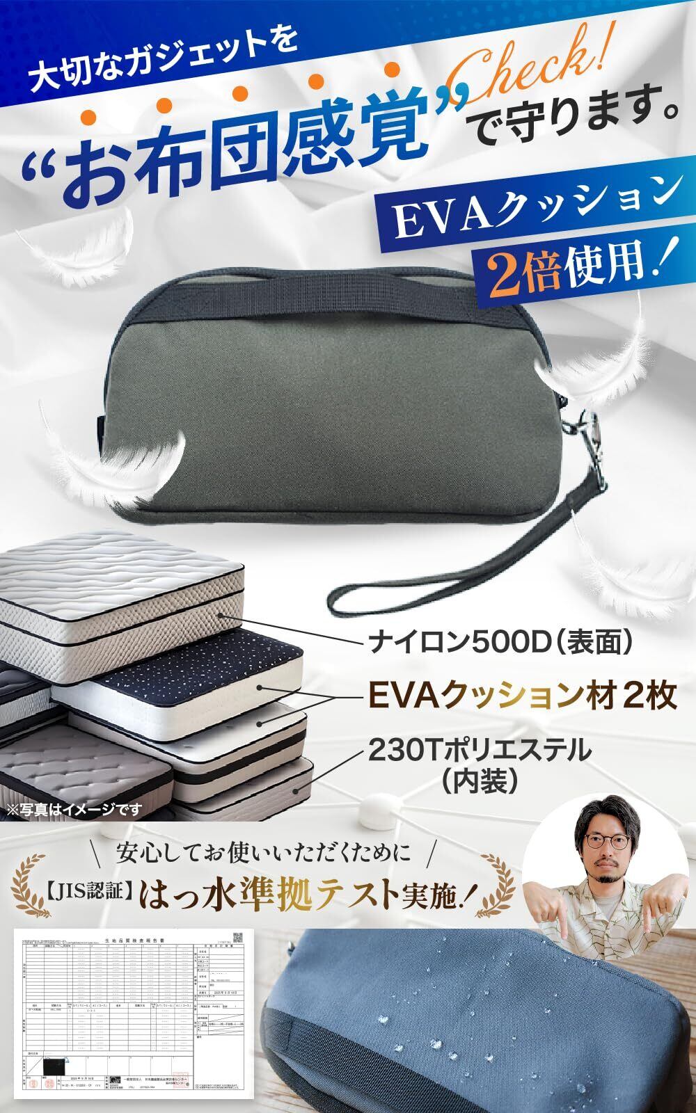 【 EVAクッション材2倍で衝撃から守る 】 高級マットレスにも使用されるEVAクッションを一般的なポーチの約2倍使用。まるで“お布団感覚”で、モバイルバッテリー・ワイヤレスイヤホン・マウスなど大切なガジェットを優しく保護します。持ち運び時の衝撃や圧力からしっかり守る設計です。