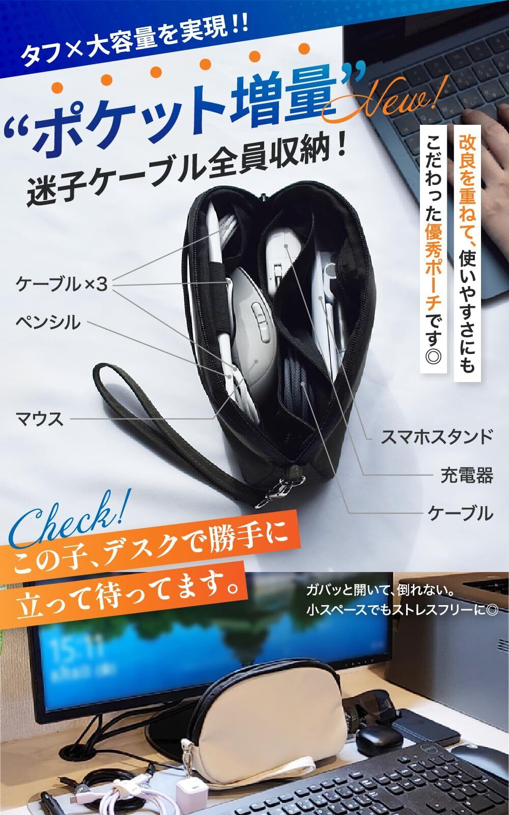 【 大容量なのにスマートなフォルム 】 ケーブル×3、充電器、スマホスタンド、マウス、ペン、モバイルバッテリーまで収納可能な大容量。なのにバッグの中で膨らみにくいコンパクト設計で、ビジネスバッグ・リュック・トートのどれにもすっきり収まります。