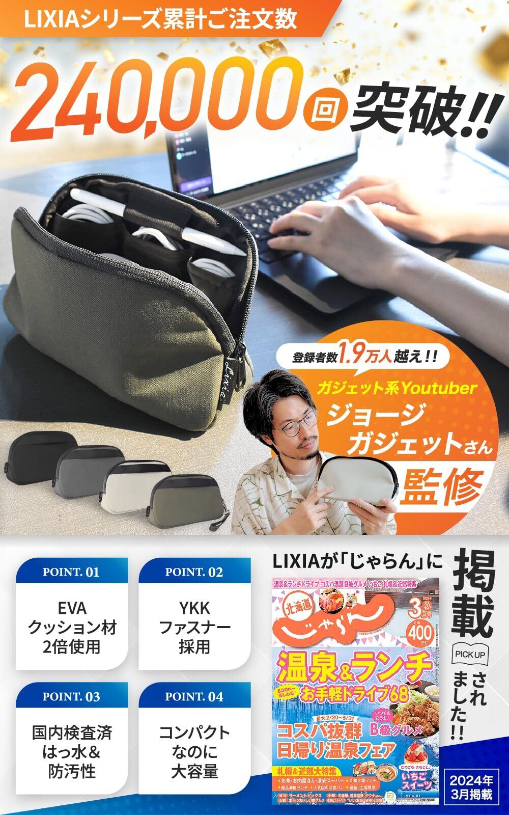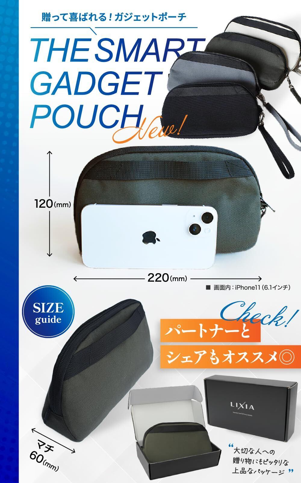【人気商品】ガジェットポーチ LIXIA 【クッション2倍で守る】自立式 スリム 防水 YKKファスナー (ブラック)