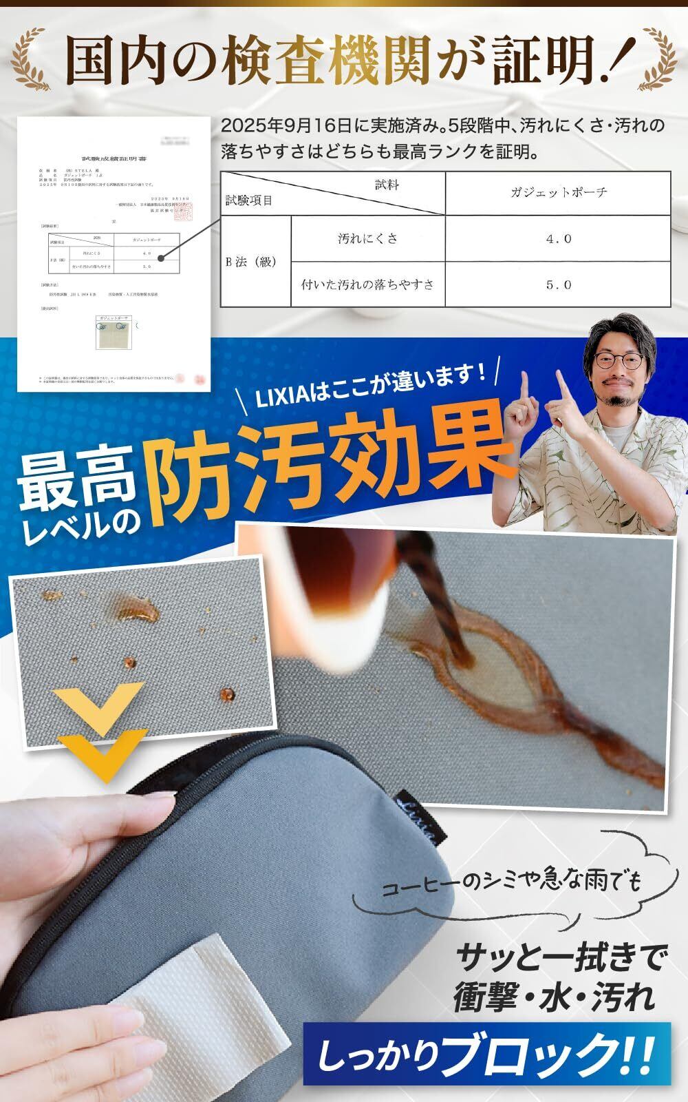 【 はっ水&防汚加工(国内検査機関で最高ランク証明)】 500D高耐久ナイロン素材に、防水・防汚加工を施し、国内検査機関にて「汚れにくさ」「汚れ落ちやすさ」いずれも最高ランク(5段階中4〜5級)を取得。雨の日やカフェでのコーヒーこぼれにも、サッと拭くだけでキレイに保てます。