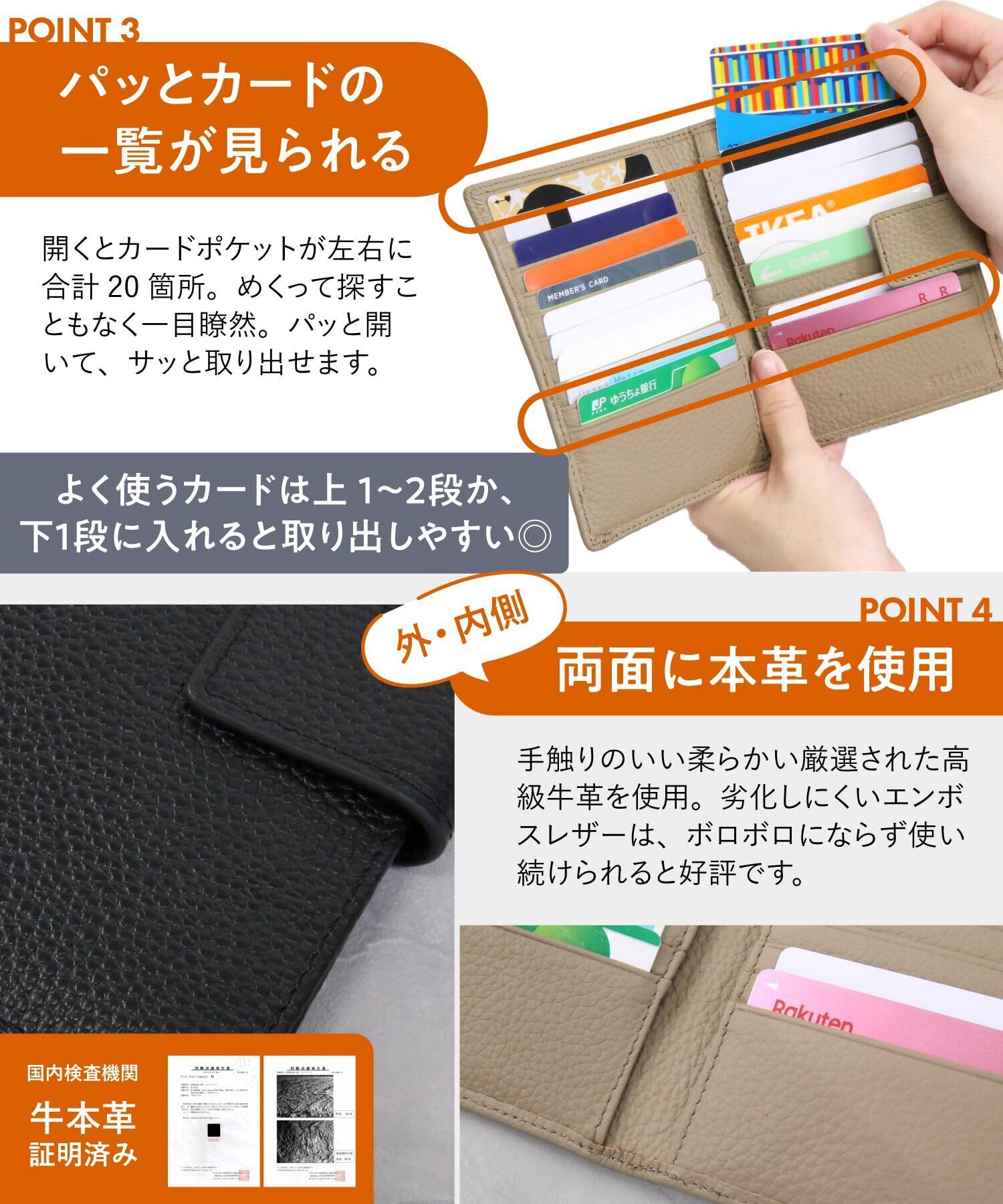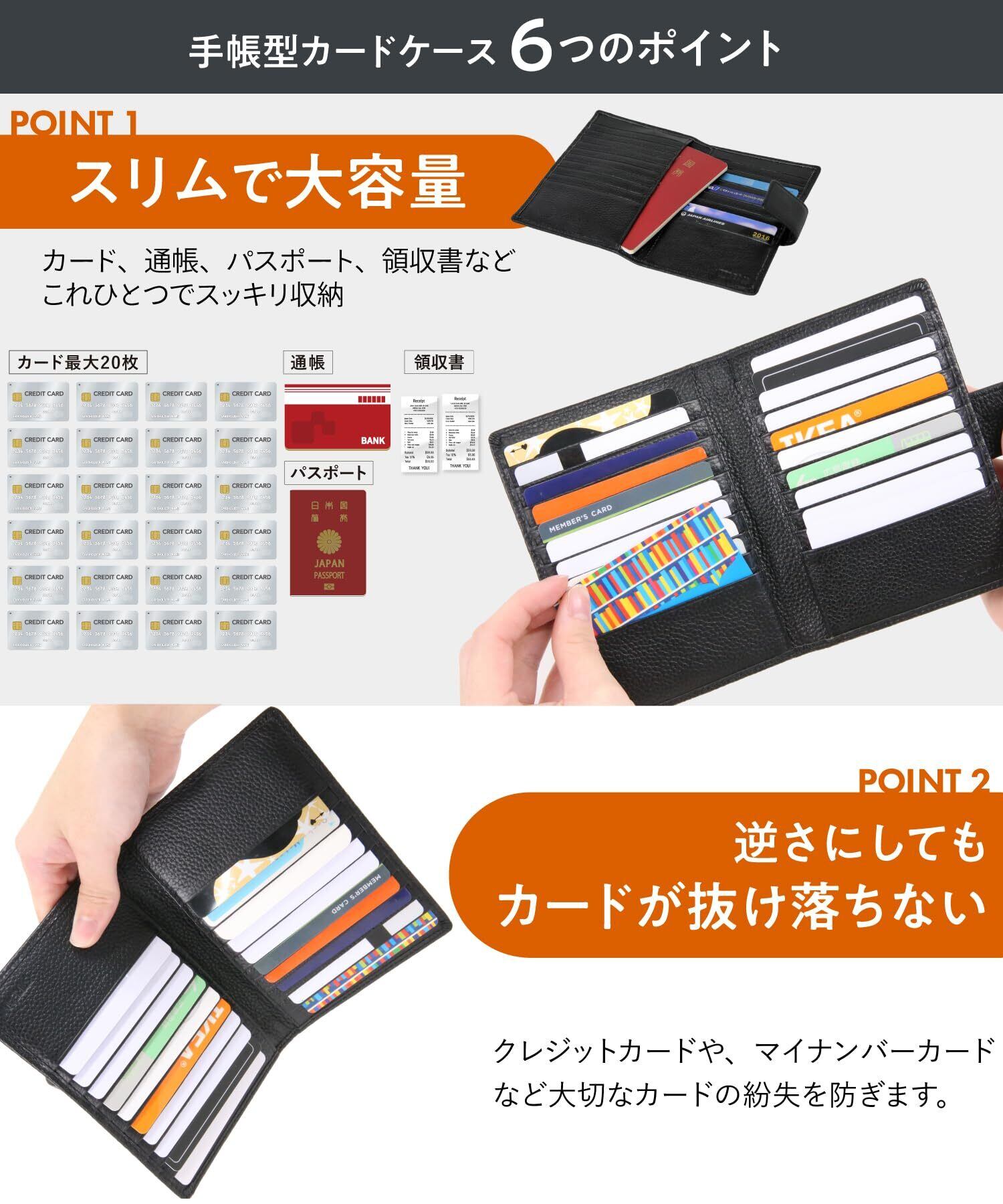 【特徴】大容量のカード類をコンパクトに収納。 二つ折り薄型で、カードは20枚収納可能です。収納時の厚さは約3センチ。鞄や財布もスッキリ。 オープンポケットが2箇所あり通帳やパスポートも楽々収納。旅行用としてもお使い頂けます。