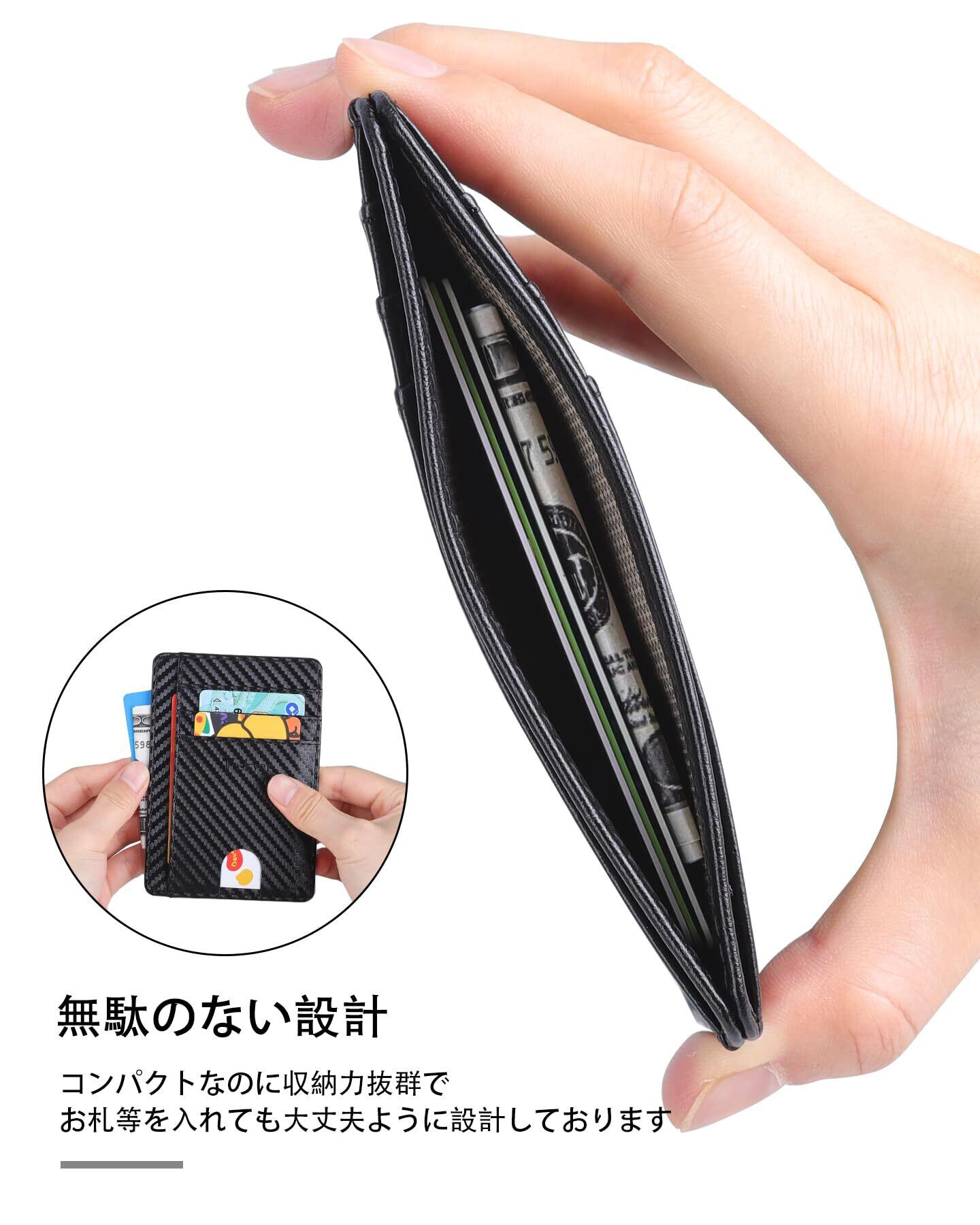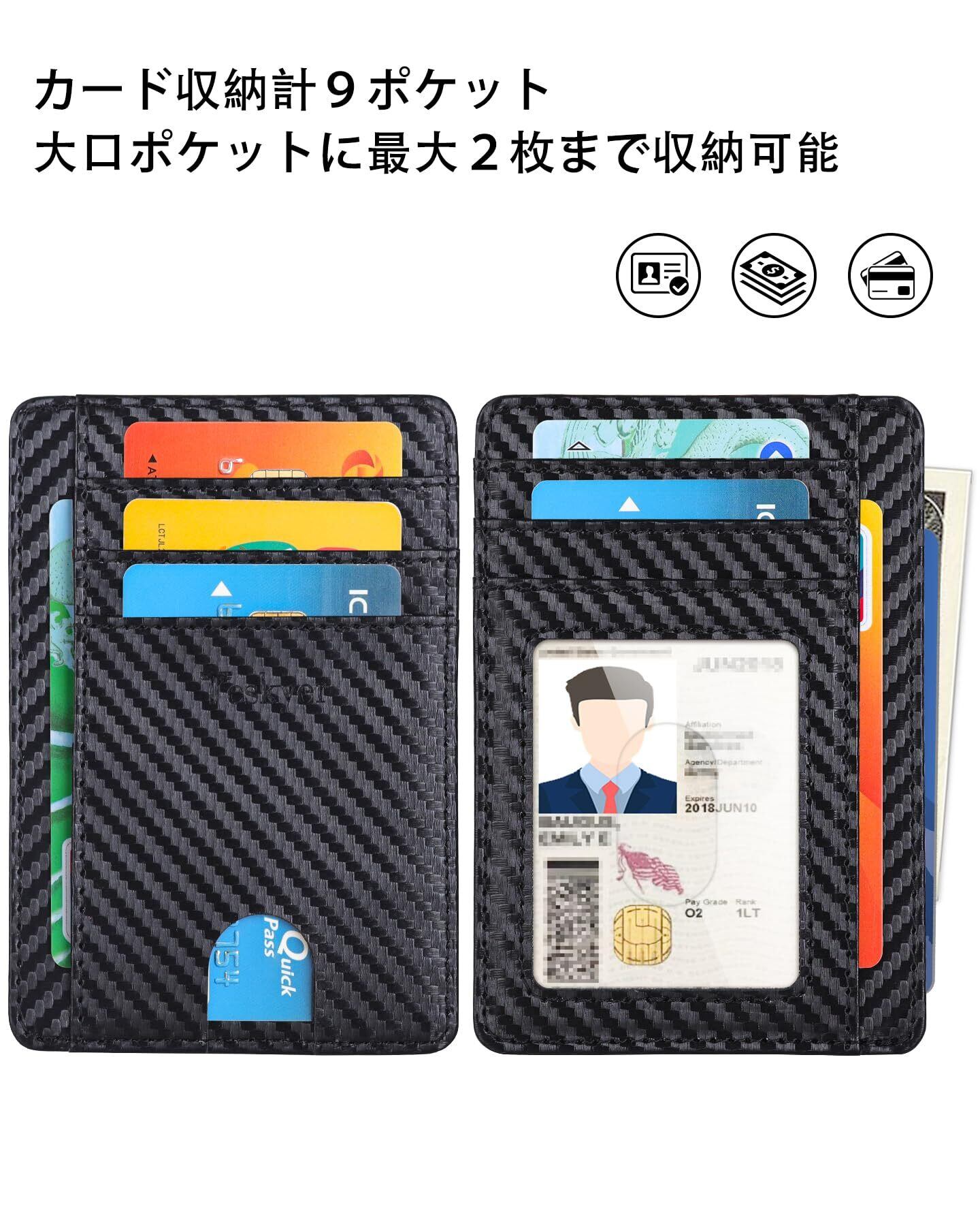 【大容量収納】スマートなカード管理が実現、無駄のない設計でスムーズな取り出し、超薄型で最大12枚のカードを収納可能でカードスロット6つで、ひと目で必要なカードを見つける。お札等入れても大丈夫設計しており、正面には透明な窓口ポケットがあり、身分証明書/写真/免許証の保管にもおすすめ。交通系ICカードやクレジットカードなど、日常生活で使用するカードを取り出しやすく、表面を指で差し出すことができます。