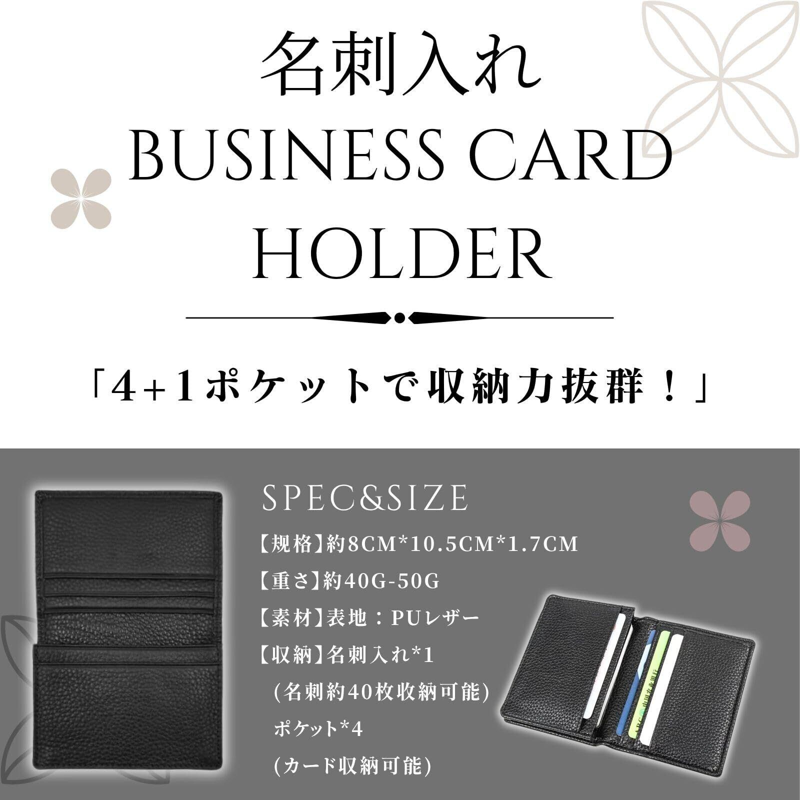 「4+1ポケットで収納力抜群!」メインポケットでは、一般的な厚み0.245mmの名刺を最大40枚まで収納できます。カード用の追加ポケットが4つあり、合計5つのポケットがあります。この多様な収納スペースは、名刺以外にも定期券やクレジットカードなど、様々な収納ニーズに対応します。