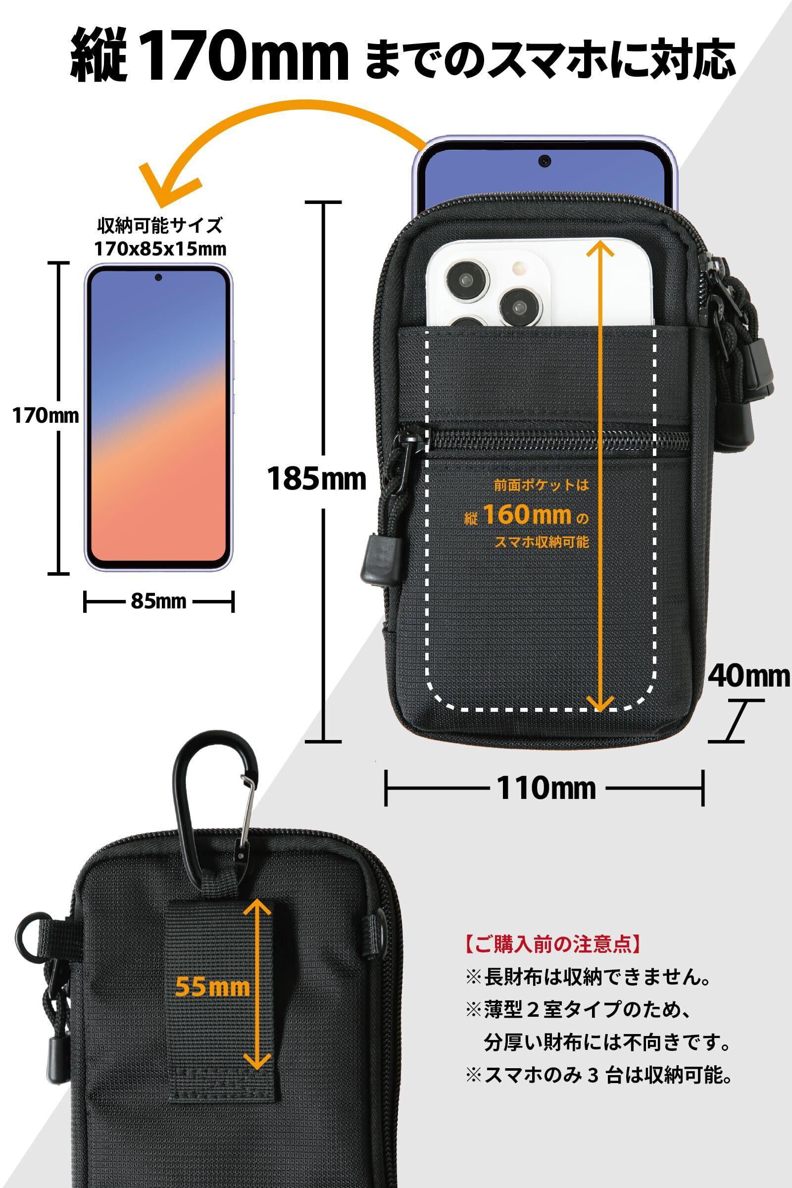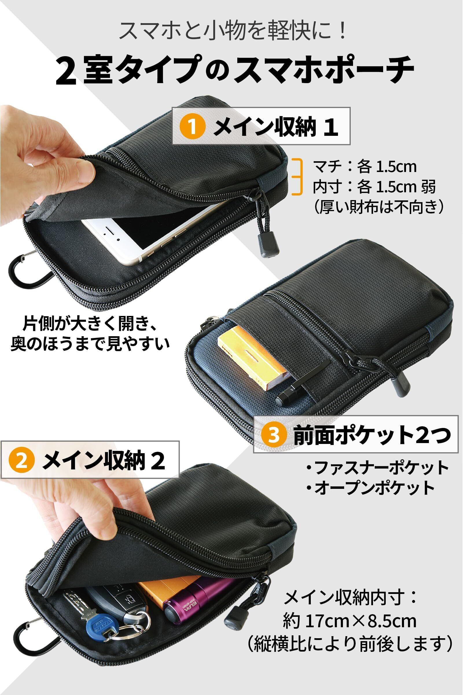 【 最低限の持ち物をコンパクトに 】 スマートフォン、鍵、小銭入れなど、最低限の持ち物を携帯するのに適した、2室タイプの薄型のポーチ。メイン収納が2室にスマホや携帯電話と小物を分けて収納できます。スマホ2台を別々に収納可能。収納できるサイズの目安は、約縦17cm✕横8.5cm。※手帳型ケースは厚みが増すため、縦16.3cmまでが推奨サイズ ※注意※薄マチのため、厚みのある二つ折財布は収納できません。長財布は縦の寸法が足りないため収納できません。