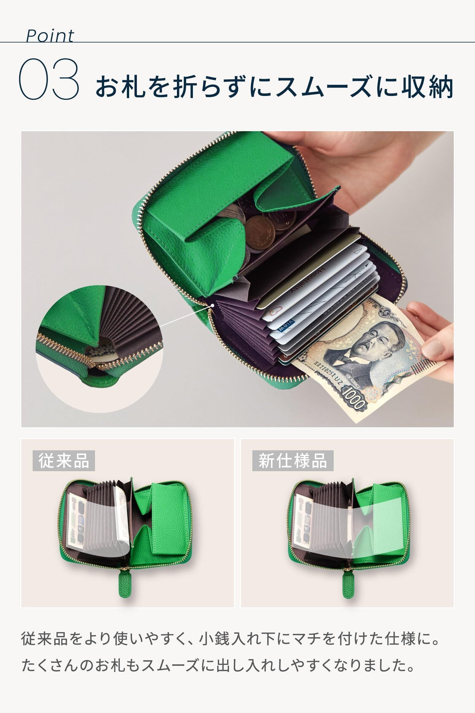 【お札を折らずに収納】カードポケットの下を通すことでお札を折らずに収納。左右どちらからでも取り出しやすく、二つ折りでも収納ができます。