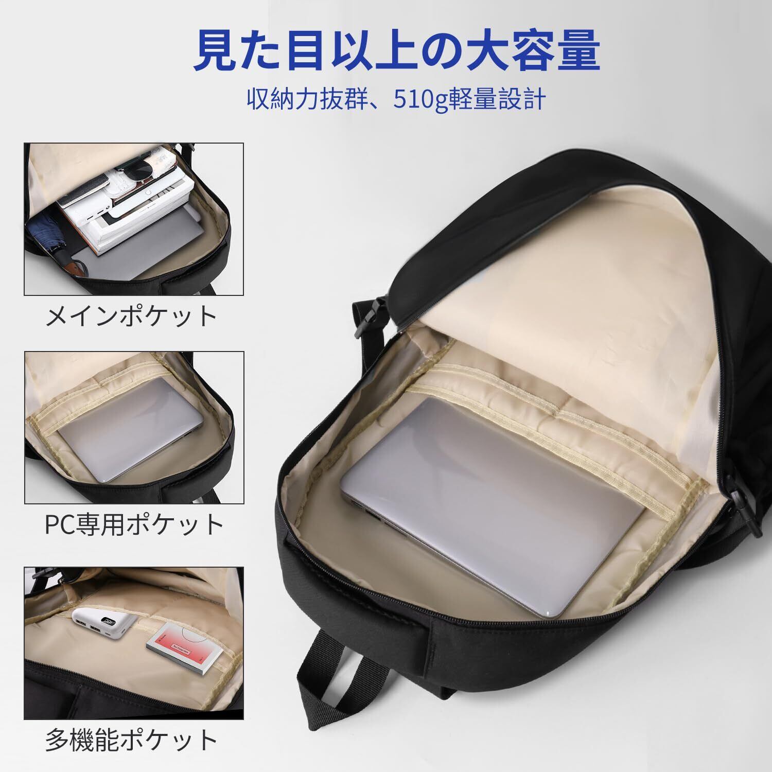 【多層構造で収納力抜群】大容量リュックはA4サイズはすっぽり収まり、15.6インチPC、タブレット、デジタルカメラ、ジャケットなどの大きな荷物も安心して収納可能!3層構造のデザインで、メインポケット、PCポケット、多機能ポケット、サイドポケットを完備し、多彩な収納ニーズに応えます!