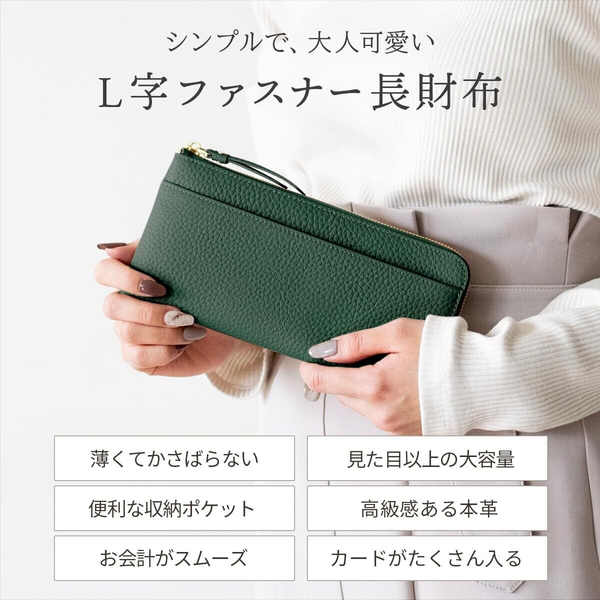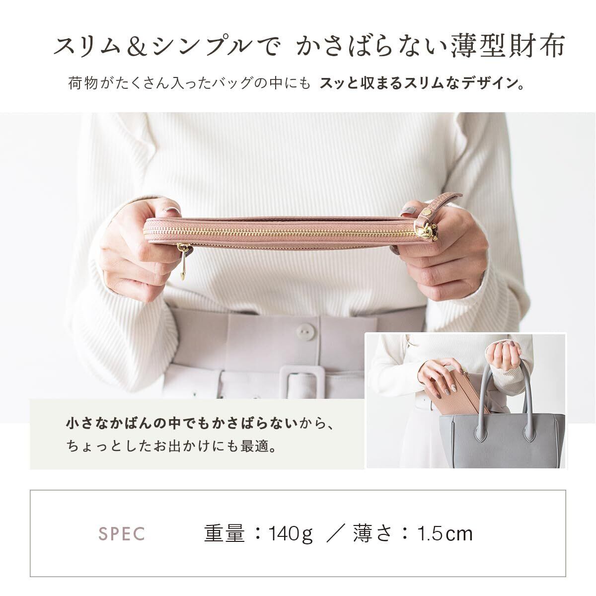 【かわいい×スリム】毎日使うものだから、かわいさにも機能にもこだわりたい。そんな方におすすめのL字ファスナー長財布です。柔らかく温かみのあるマットな本革を使用し、どの角度から見ても上品なたたずまい。厚みはわずか15mm。小さめカバンにもすっきり収まります。