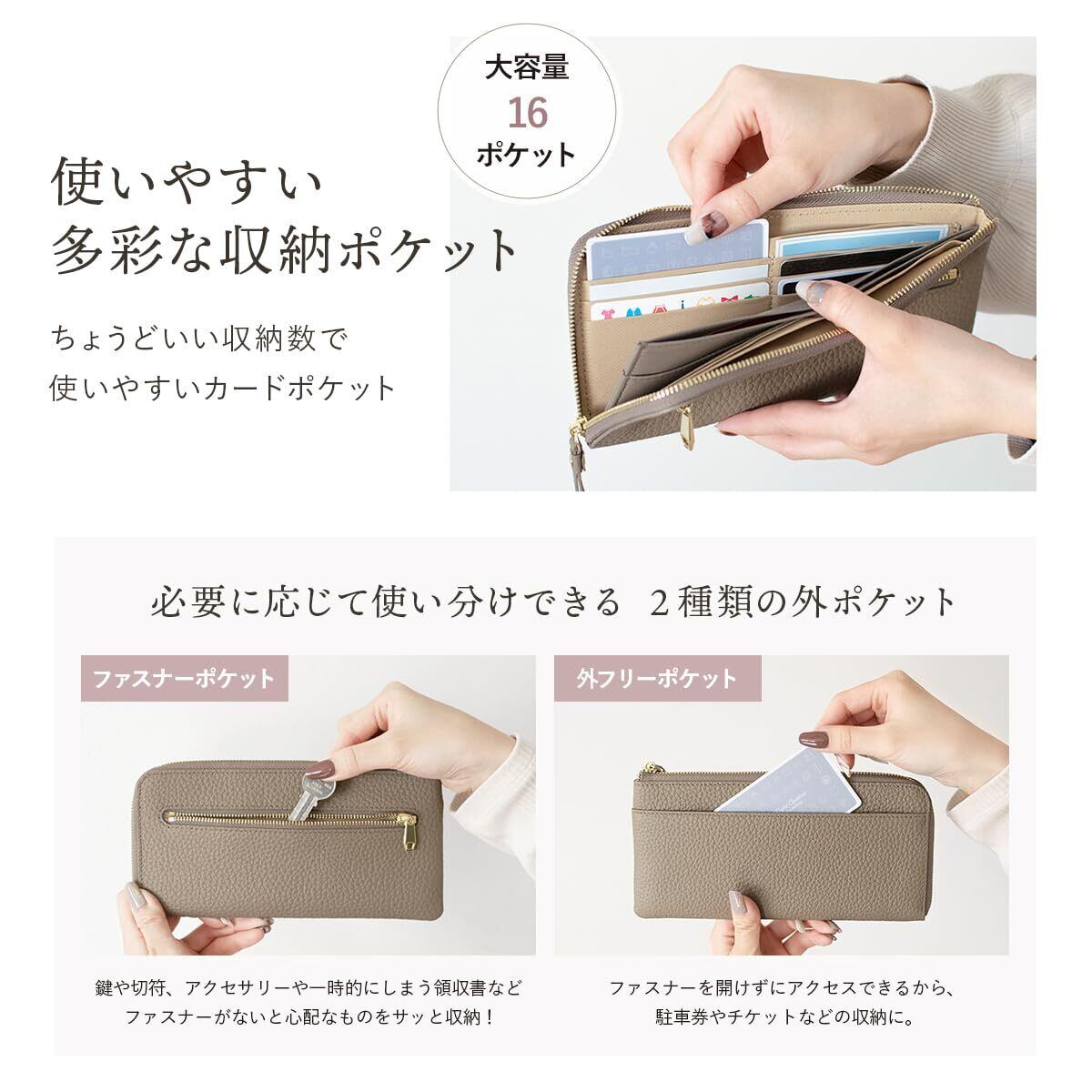 【見た目以上の大容量】16枚分のカードポケットに、フリーポケットやファスナーポケットが付属。絶妙な高さに計算されたファスナーレスの小銭入れ。整理が簡単で、目当てのものが見つけやすい構造です。L字ファスナーを開くだけで硬貨・お札・カードにアクセスできるので、お会計もスムーズに。