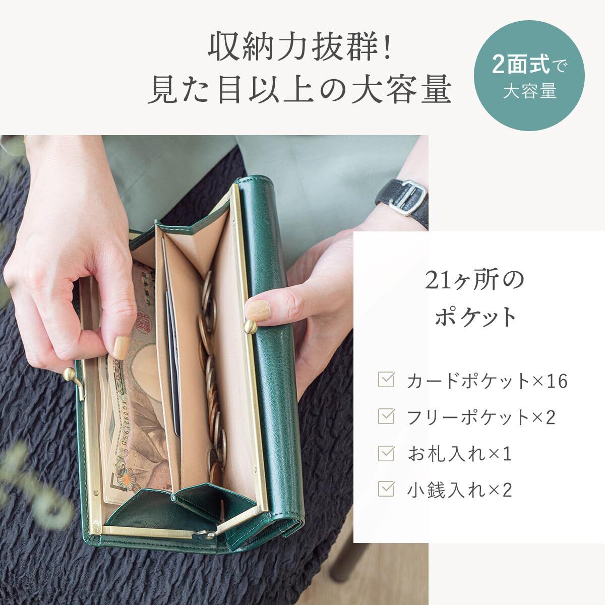 【大人かわいい がまぐち長財布】ガバっと大きく開くがま口小銭入れは、仕切り付きでレシートの収納に困りません。反対側はマチ付きお札入れと大容量16枚のカードポケット。フリーポケットもプラス。 充実の収納力に隅まで見渡せる使いやすさ。大容量を気兼ねなく持ち運び。