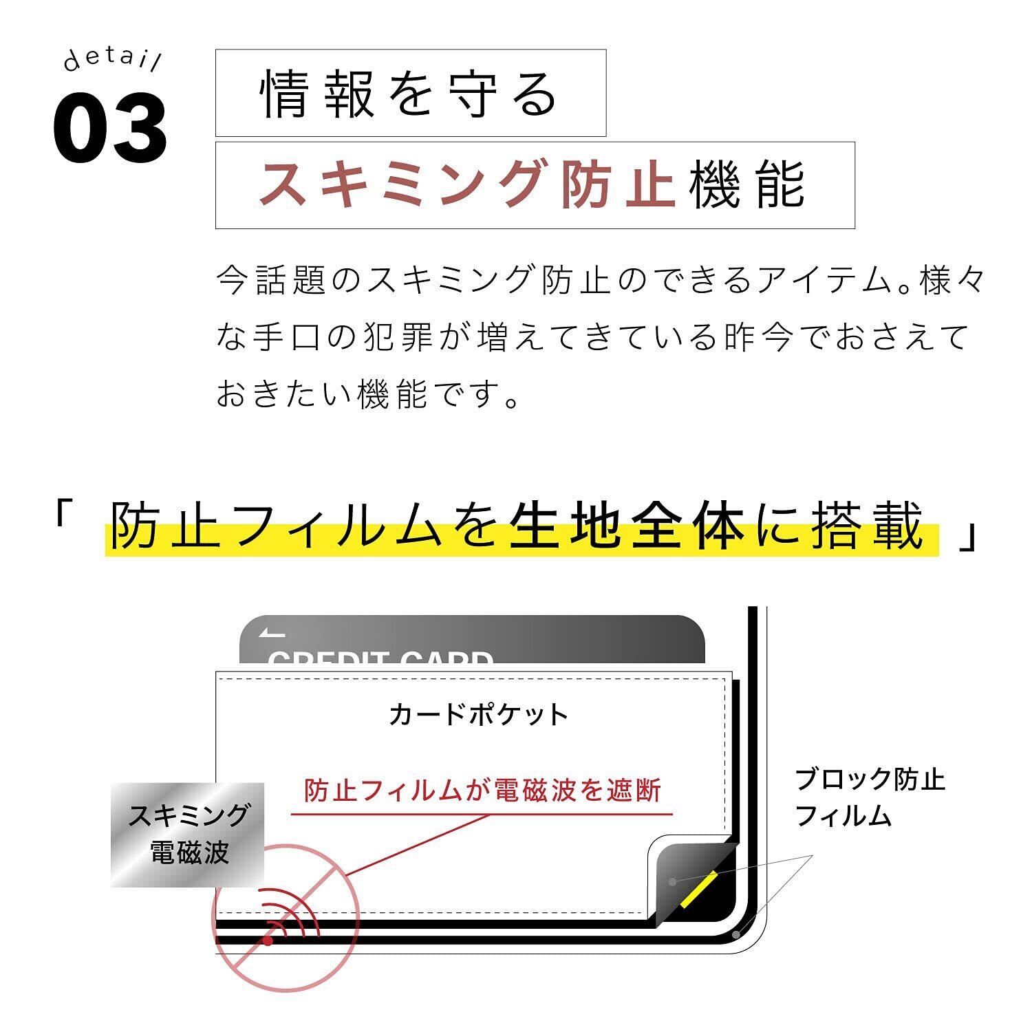 【 お財布を守る!RFIDスキミング防止機能付き 】クレジットカードなどの個人情報の入った磁気情報を盗み取られるスキミング被害に必要なのはRFIDスキミング防止機能。本製品はスキミング防止フィルムをカードケースに搭載し、カードの大切な情報を守ります。