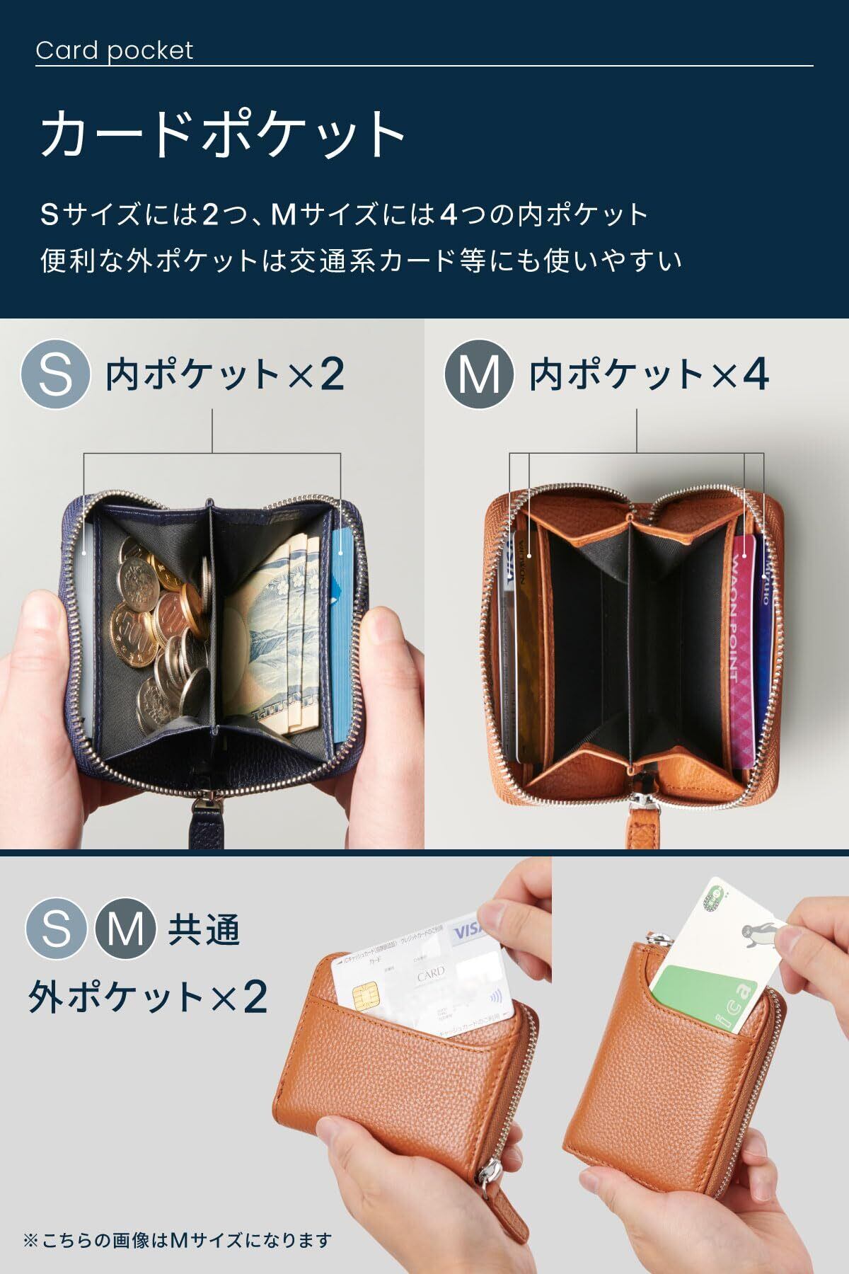 【detail】:お札は2つ折りで収納でき、小銭を取り出しやすいように大きく開きます。カードポケットはクレジットカード入れ × 4 に設定し、外ポケット × 2の構造で交通ICカード(suica nimoca pasmo nicoca)等々を収納したままタッチ通過できる小銭入れ付きパスケースや、とりあえずのレシートを入れにも。