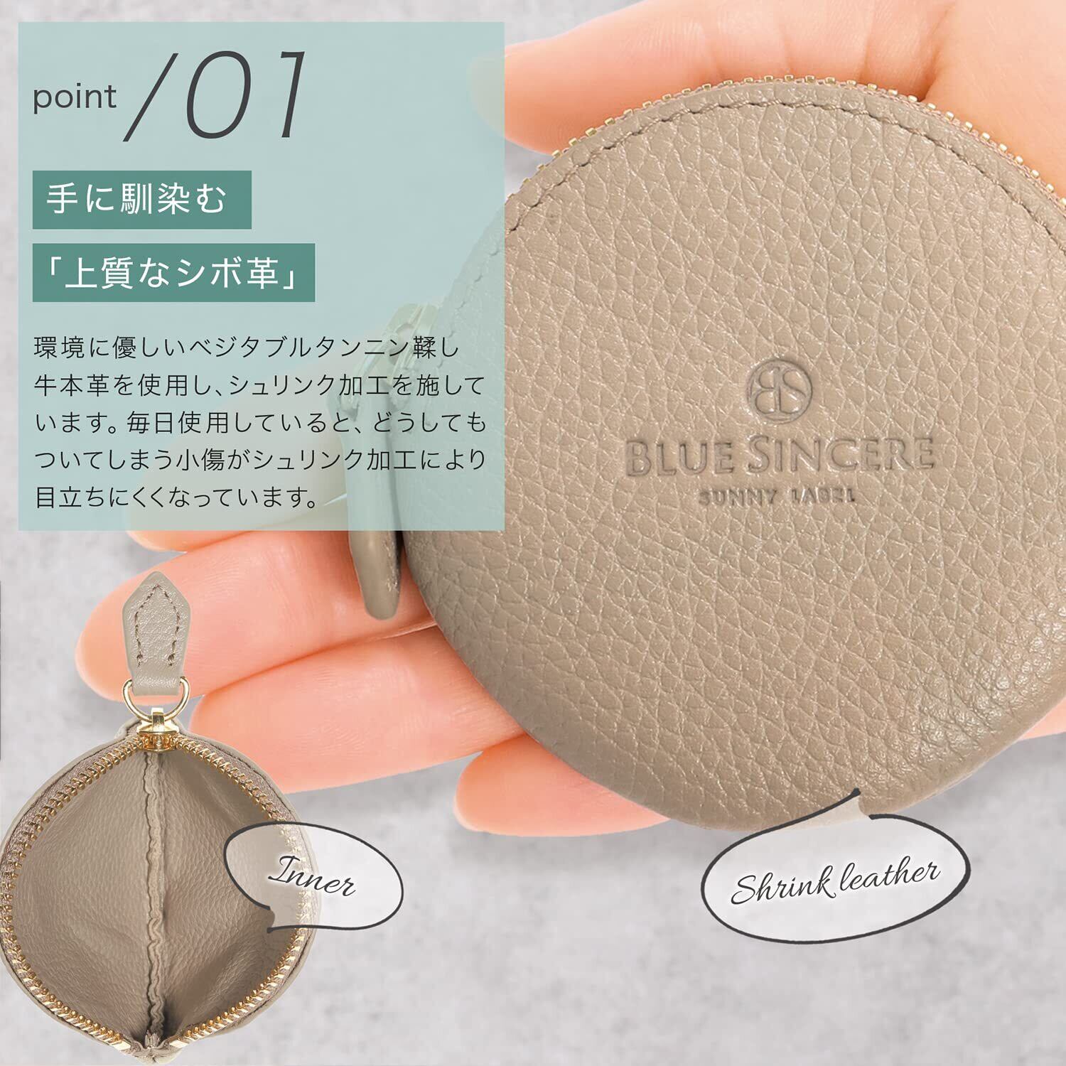 【 サイズ × 素材 】サイズ:縦7.5cm × 横7.5cm × 厚さ0.5cm 重量:約15g 素材:シュリンクレザー(ベジタブルタンニン鞣し本牛革) 仕様:メインポケット×1 【 ご注意 】 ※ BLUE SINCEREが製造・販売する製品は知的財産権の取得を随時行っております。