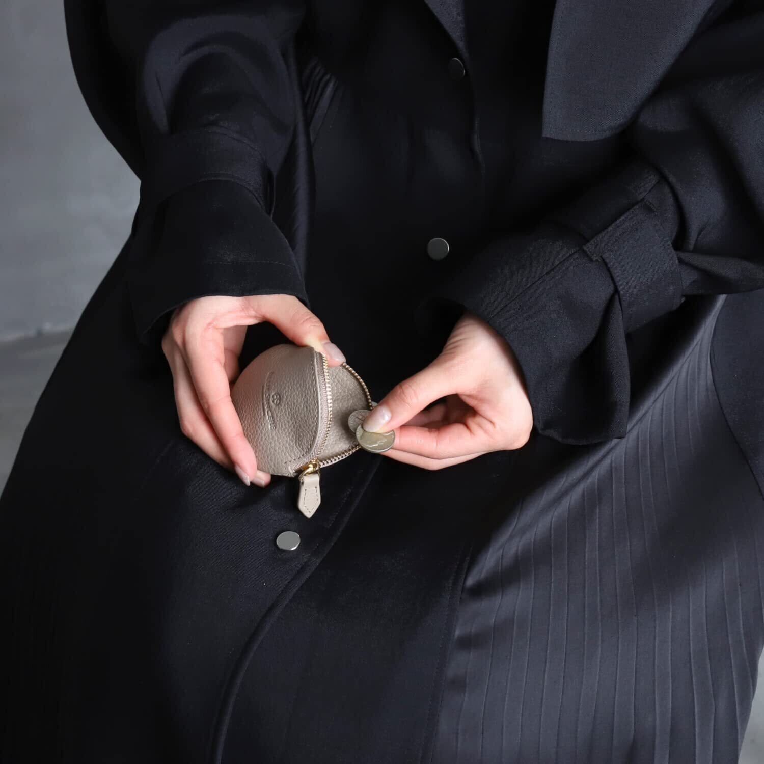 【 ガバッと開く開口部 】小銭やお札だけでなく、ピアスやネックレス、指輪など小物系を収納し、スムーズに取り出しやすくするためにファスナー部分は180度まで広げました。これにより、ガバッと広げ、手のひらにまとめて出すことで日常のストレスを無くすことができます。
