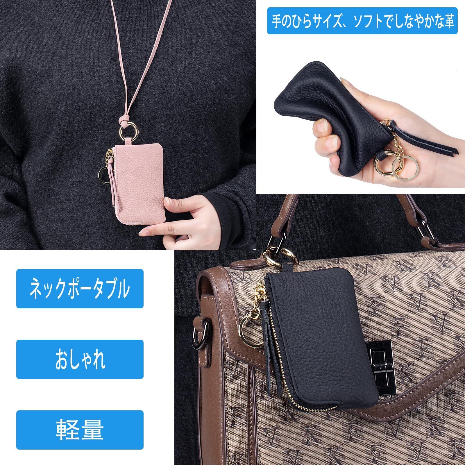 【新着商品】本革 小銭入れ レディース ネックストラップ付き パスケース 首掛け 定期入れ おしゃれ 人気 ジッパー コインケース キーホルダー付き 軽量 コンパクト IC IDカード入れ 落下防止 革 財布 大人 子供 通勤 通学 旅行 便利 ブラック