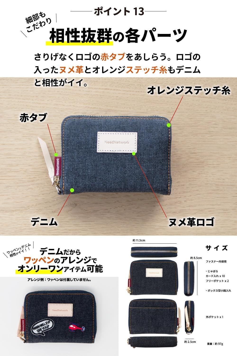 【デニム好きには、たまらない】あなただけの色落ちを楽しむ。ミニ財布ガバッと開いて中身が見やすい ▶︎ じゃばら式で大きく開く。カードも小銭もお札も。世界でも名高い日本製デニムから厳選したデニム生地を使用した小銭入れカードケース ▶︎この高品質なデニム生地は、海外のモノを圧倒する品質レベル。腕利きの職人が一切の妥協を許さない使い込むほど味が出る ▶︎色落ちの風合いは、一般的なデニム生地と比べものにならない。自分だけのオンリーワンに育てるならコレ。手にひらサイズで大容量 ▶︎小さいのに色々入る。出し入れしやすい小銭入れ▶︎大きく開くボックス型お札を折らずに収納 ▶︎ 一万円札も折らずにOK。スキミング防止機能 ▶︎ 12のカード収納。相性抜群の各パーツ ▶︎さりげなくロゴの赤タブをあしらう。ファスナーのヌメ革とオレンジのステッチ糸もデニムと相性がイイ。サイズ、横 約11.5cm 縦 約8.5m 厚さ 約2.5cm ■重量、約97g
