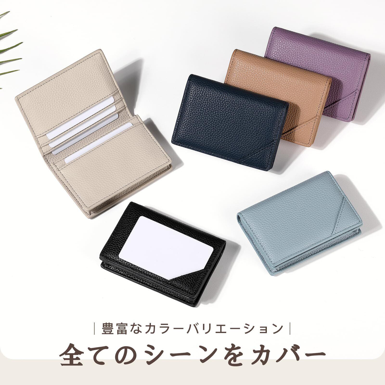 コンパクト設計・大容量収納 サイズ:横11cm×縦7.9cm×厚み1.5cm(重さ約53g) メインポケット×1 + サブポケット×4の多機能仕様。 名刺約40枚収容可能で、ビジネスカードや小物も整理できます。