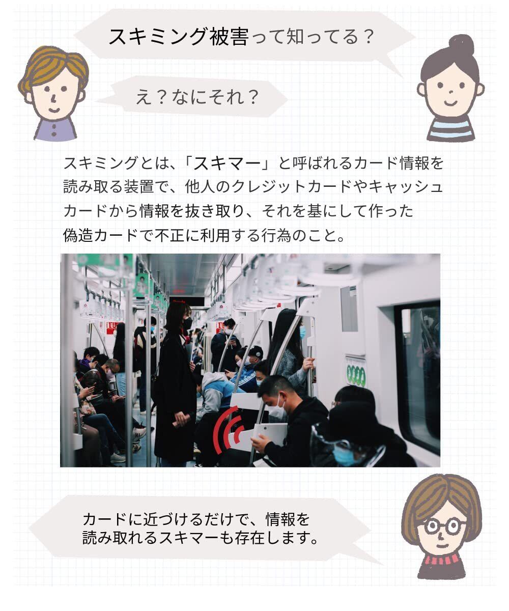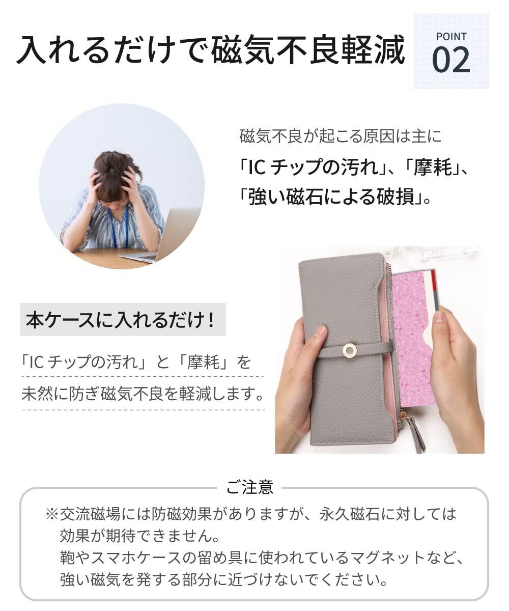 磁気不良軽減 : 磁気不良が起こる原因は主に「ICチップの汚れ」、「摩耗」、「強い磁石による破損」。本ケースに入れるだけで、「ICチップの汚れ」と「摩耗」を未然に防ぎ磁気不良を軽減します。※交流磁場には防磁効果がありますが、永久磁石に対しては効果が期待できません。鞄やスマホケースの留め具に使われているマグネットなど、強い磁気を発する部分に近づけないでください。