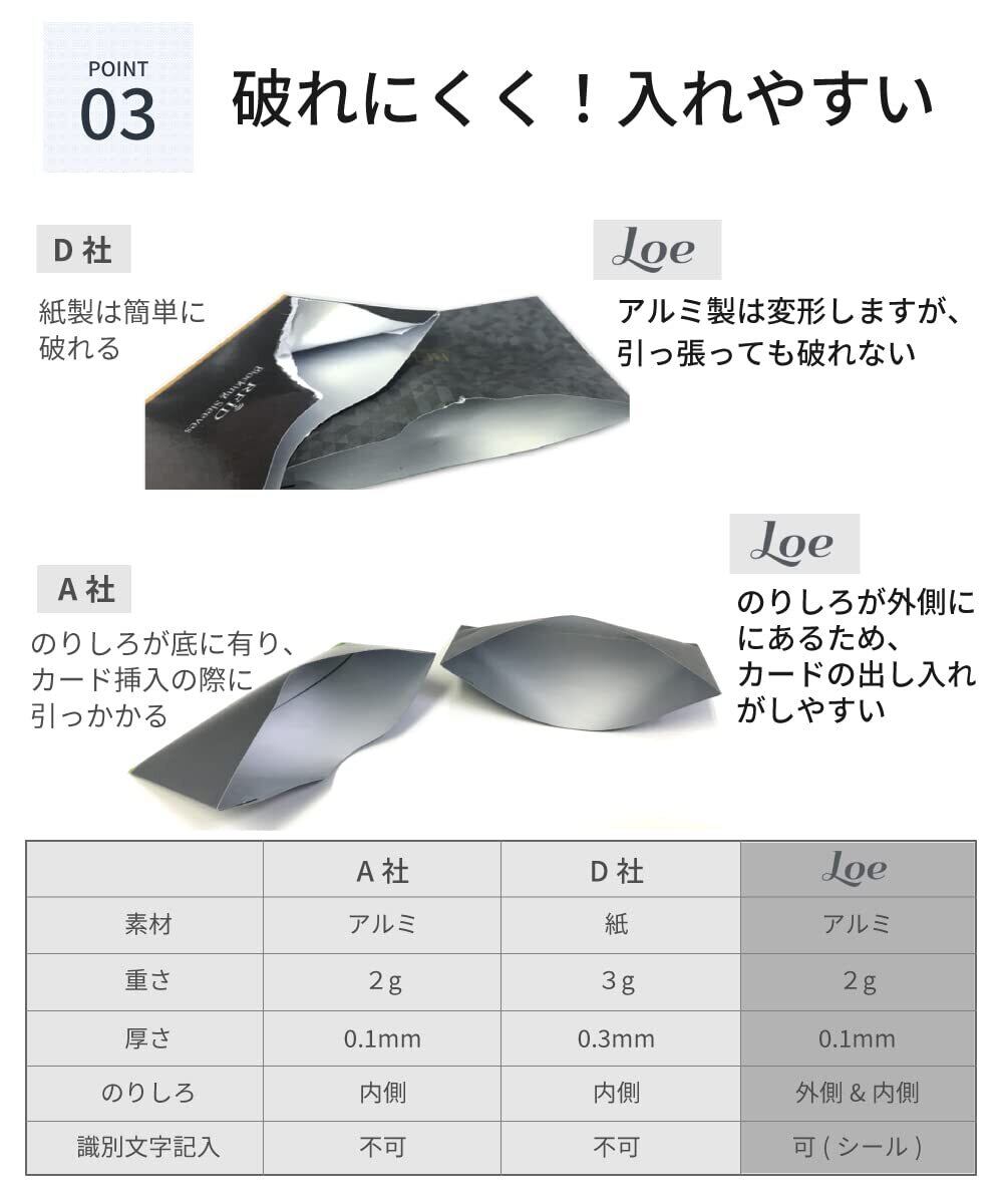 丈夫な素材 : 大手IC専門メーカーとの半年もの共同開発におけるトライアンドエラーから特殊な工法を検討し、さまざまなICカードに対応したスキミング防止カードケースを製品化しました。LOEの極薄カードケースは一般的な紙製と異なり薄くても引っ張っても破れません。