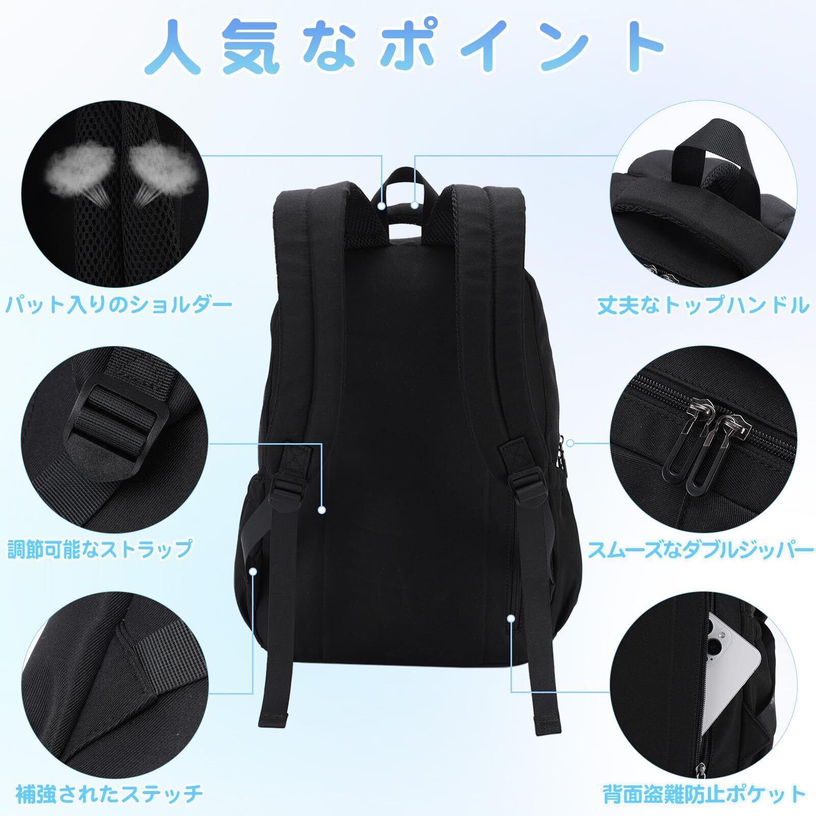 豊富なポケット:ポケットいっぱいだから楽しく整理整頓がしやすいです。2メインコンパートメント「(第一層)前面ファスナーポケット×1:メッシュポケット×1+15.6インチPC収納部×1+ファスナーポケット×1;(第二層)大きい前面ポケット×1」;外側にはゴム付きのサイドポケット×2、前面には磁気スナップ付きのケット×2、小さなファスナーポケット×2、オープンポケット×1、背面にはファスナーポケット×1、合計15つポケットを備え、教科書、A4ファイル、15.6インチPC、水筒、折り畳み傘、ペンケース、お出かけにもつかえて楽しくなります。