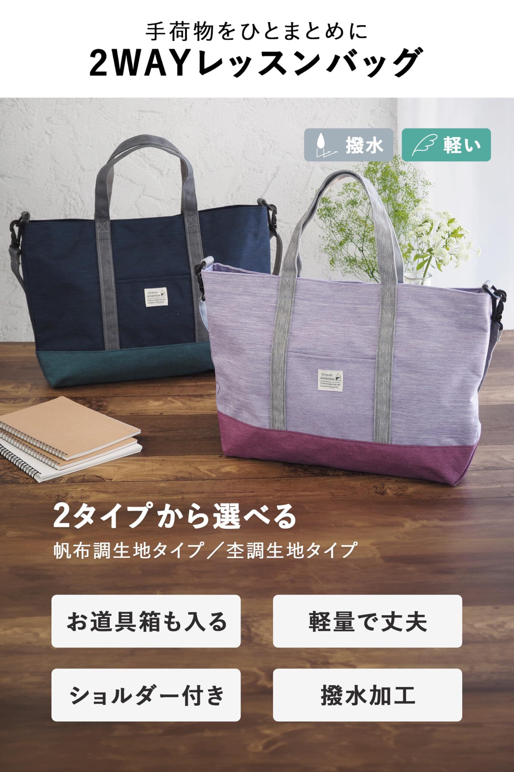 荷物が多くてレッスンバックが必要な小学生のために設計された、A4サイズのファイルやお道具箱もしっかり収まる,撥水加工の手提げバッグです。2WAY仕様でショルダーとしても使えるレッスンバッグは、ひっかけループ付きで、小物収納にも便利なポケット完備!また、ネームタグは内側にあり、男の子・女の子問わず使える、反射材チャームが付いているなど、親目線でつくられたレッスンバッグ。通塾バッグやピアノのレッスンバッグとしてはもちろん、大人の方のおけいこバッグにもおすすめです。