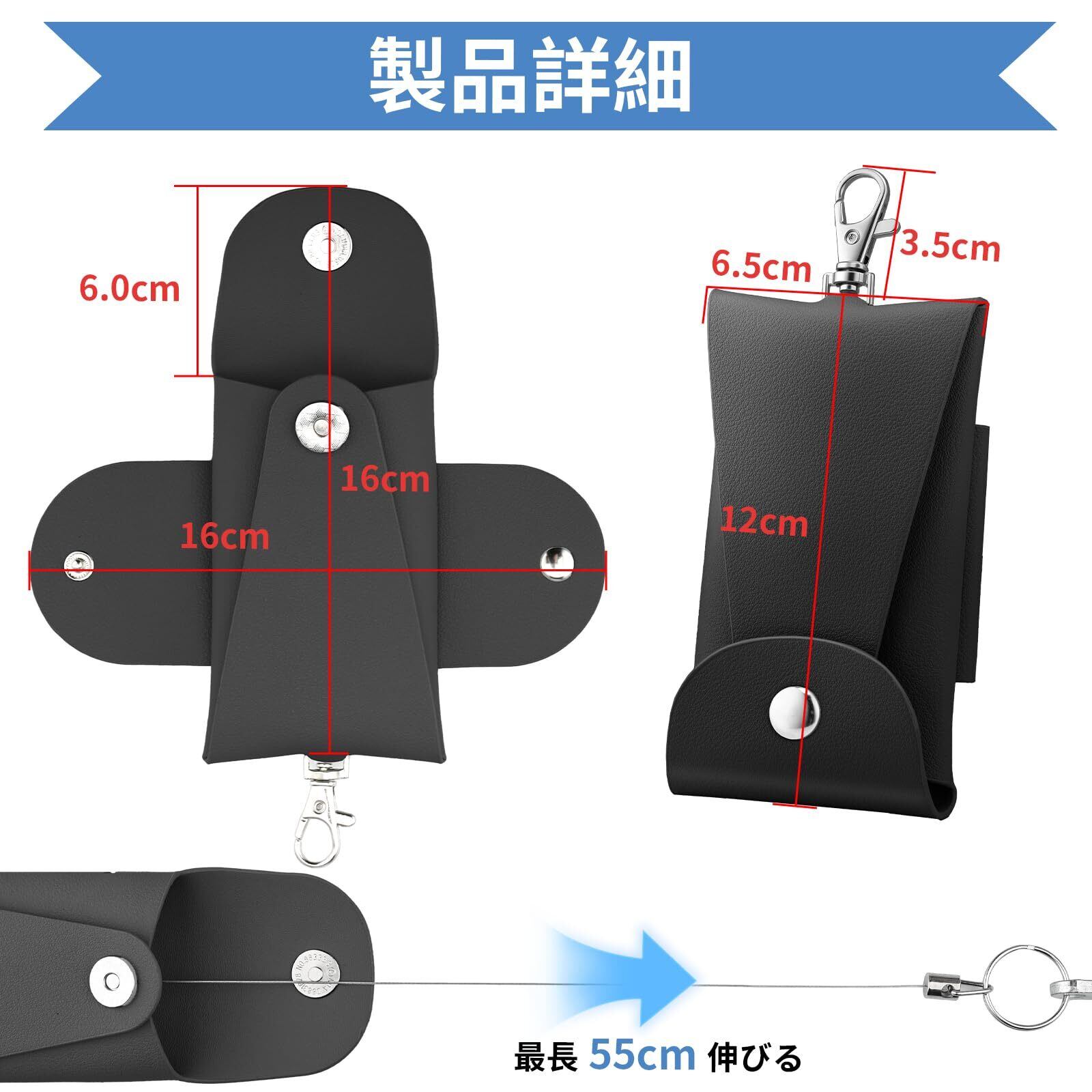 【55cmまで伸縮可能なリール式設計】伸縮可能なロープは最大 55cmまで延伸し、お子様の腕の長さにもしっかり対応、子どもでもカバンの肩ベルトに取り付けたまま、キーを簡単に取り出せます。広めの取り出し口で小さな手でも使いやすく、玄関前でもたつくことなく、施錠・解錠をスムーズに行うことができ、通学時の時間の無駄を防ぎます。伸縮後は自動的に元の位置に戻り、鍵の紛失を心配する必要がありません。