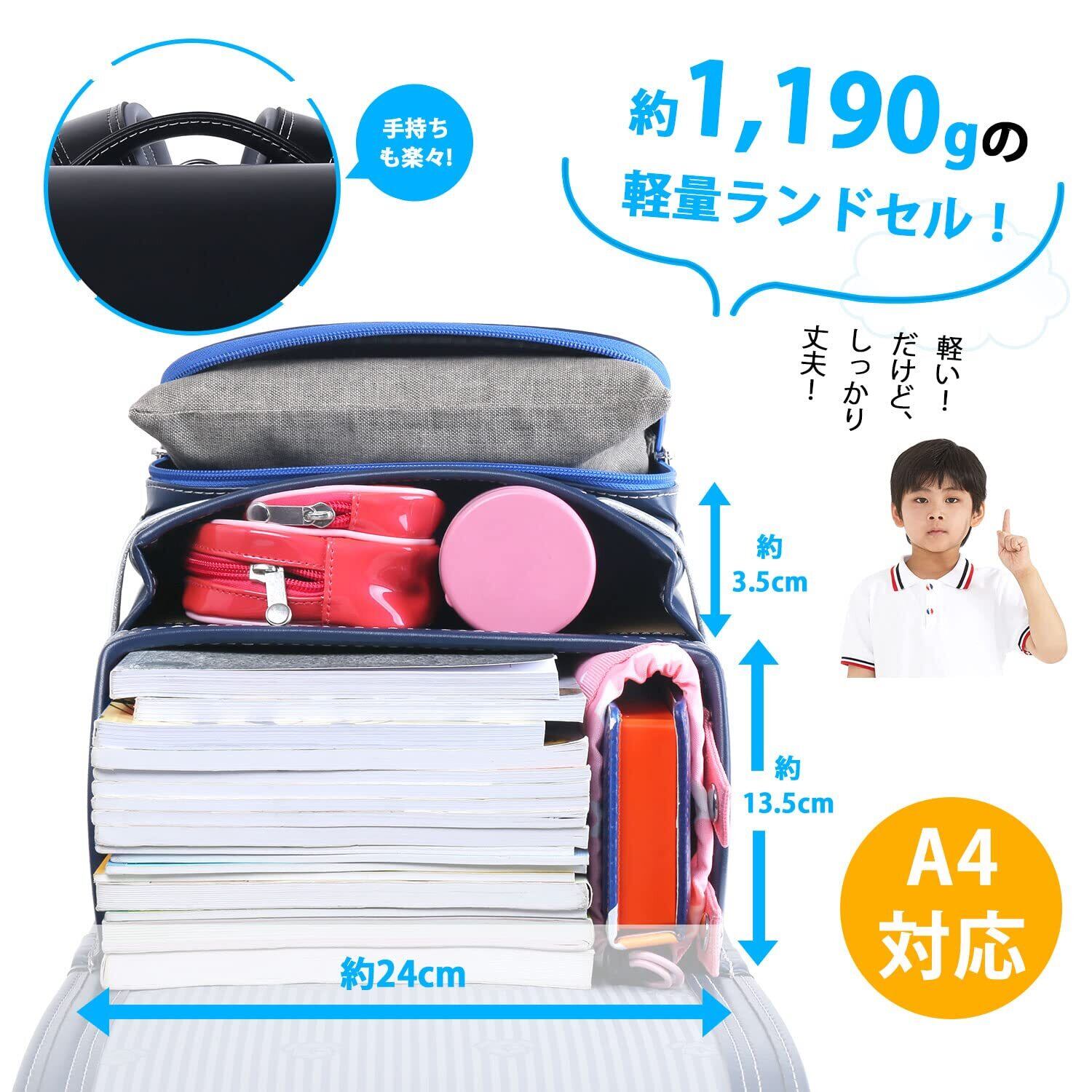 【商品仕様】・素材:高級イミテーションレザー・重さ:約1,190gの軽量ランドセル!軽いだけど、しっかり丈夫!・外寸 約 奥行210×横幅270×高さ350mm・内寸 大(小)マチ 約奥行 135(D35)×横240(W230)×縦310(H260)mm・金具 銀色系ニッケル合金