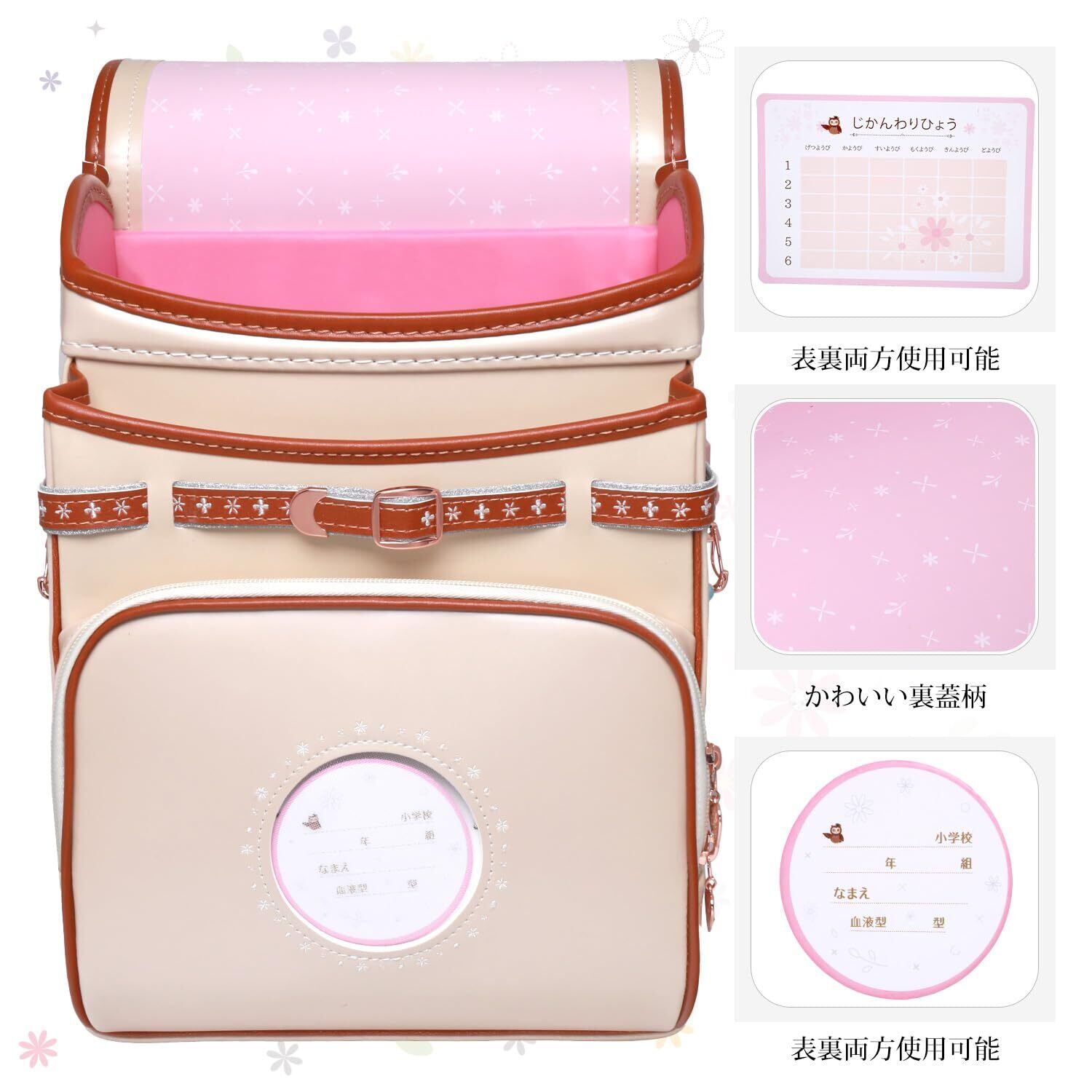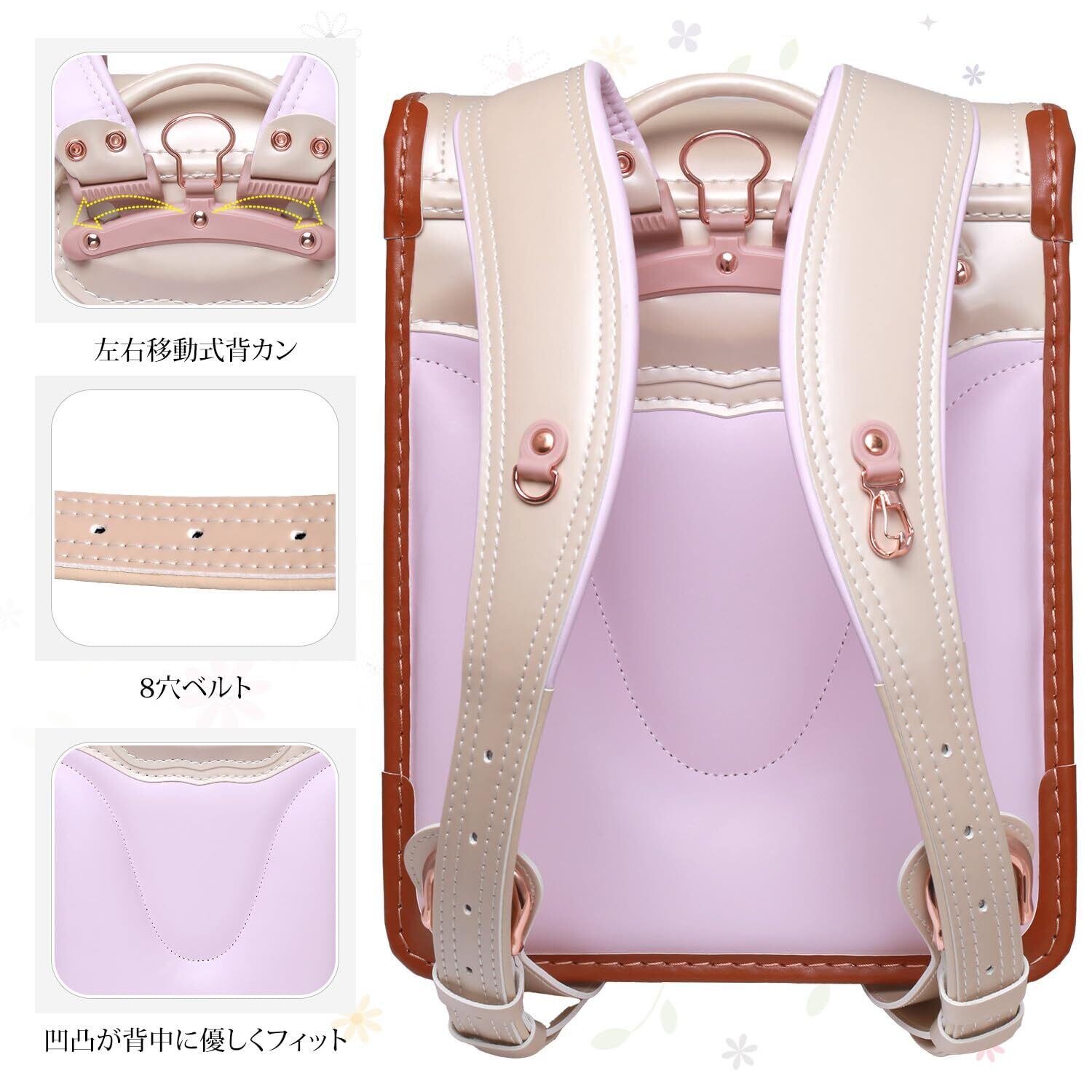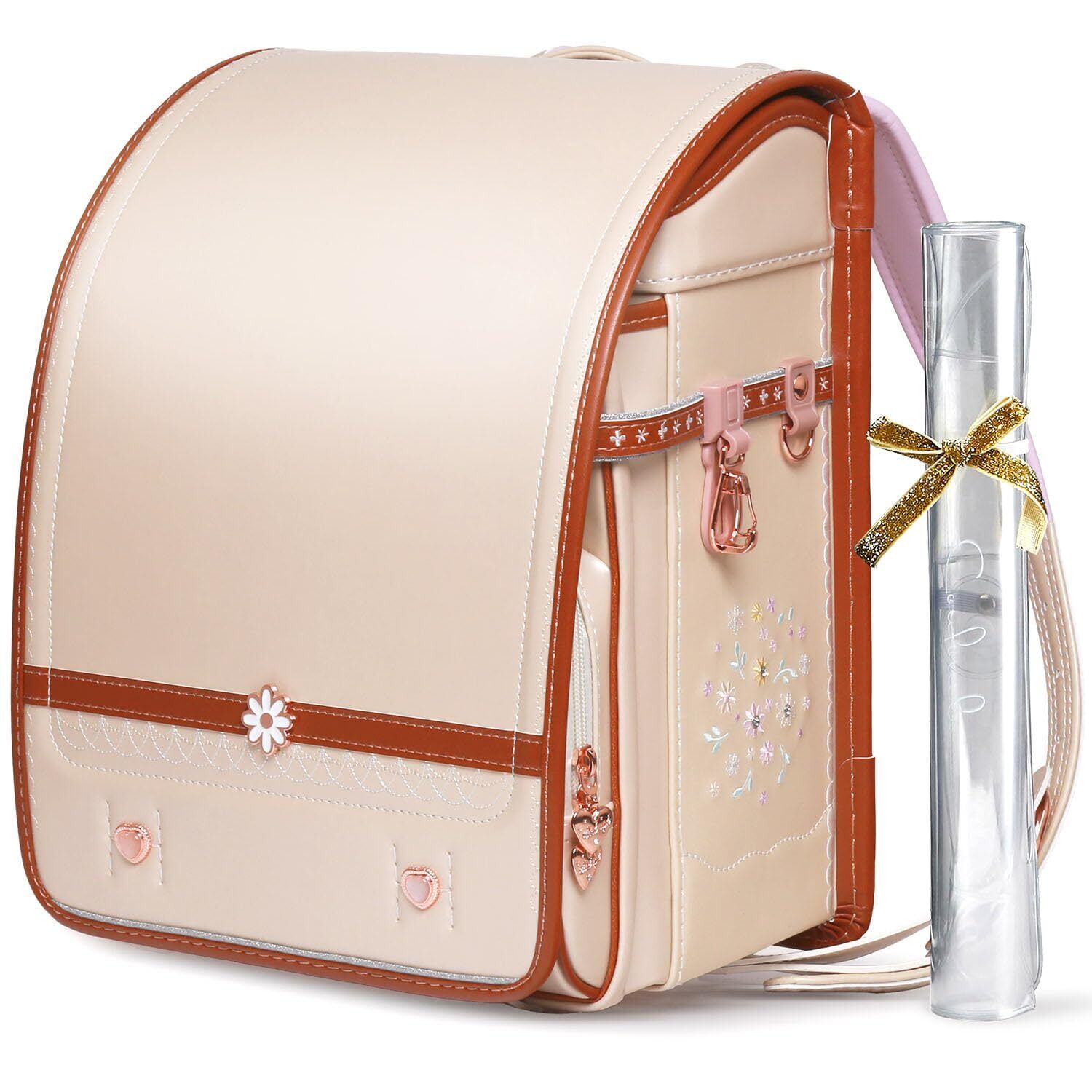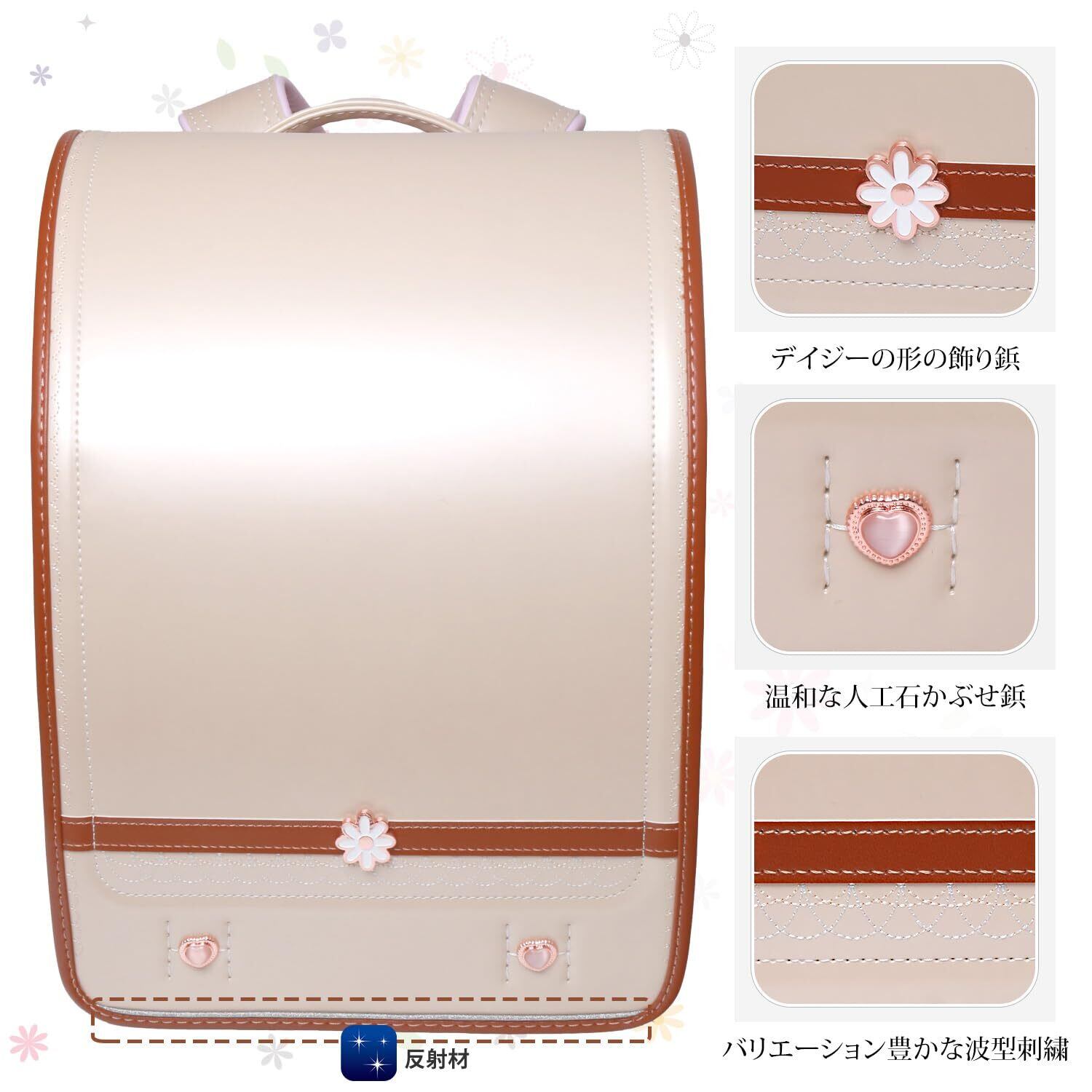 【2025向け】最新女の子向けランドセル、マーガレットモデル、ローズゴールド系金具、5色展開(桜色/水色/紫色/月白/ベジュー)。 フレッシュでかわいい小花モチーフは、高学年になっても飽きさせない美しさと機能性を兼ね備えた上品なランドセルです! ツヤありパール生地使用、カラフルな刺繍付き、人工ダイヤモンド飾り、ビーズチェーンDIY可能、 楽しさいっぱいの女の子ランドセルです。