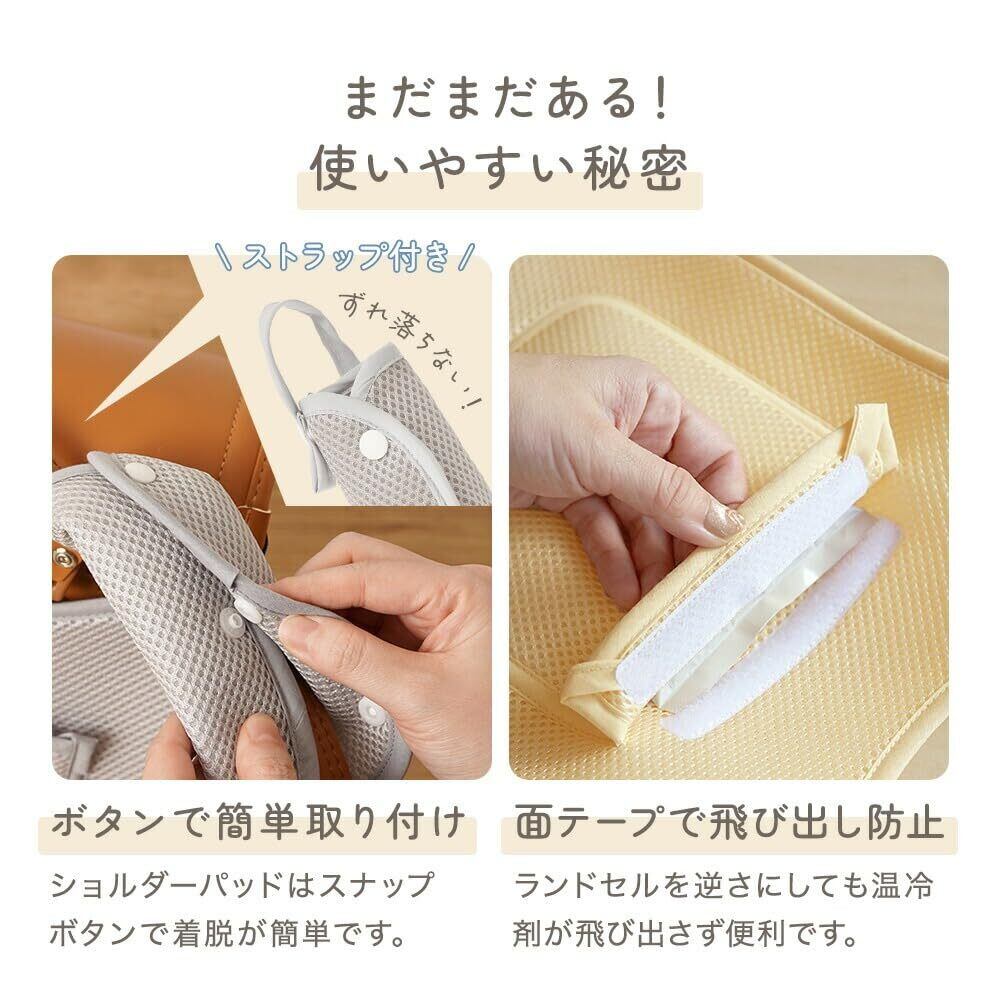 通気&クッション性の高いメッシュ素材の背中パッドとショルダーパッド。付属の温冷剤が、ポケットにすっぽり入る! 繰り返し使えてとってもエコ。