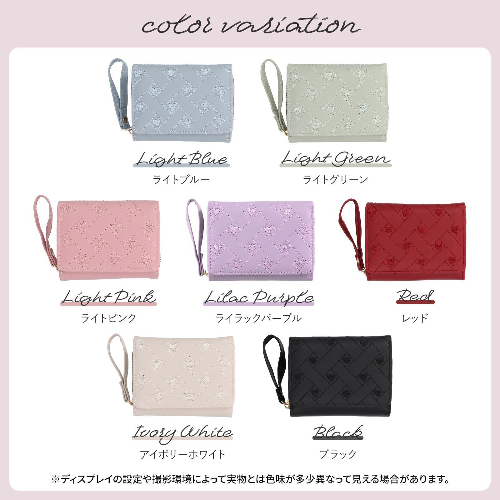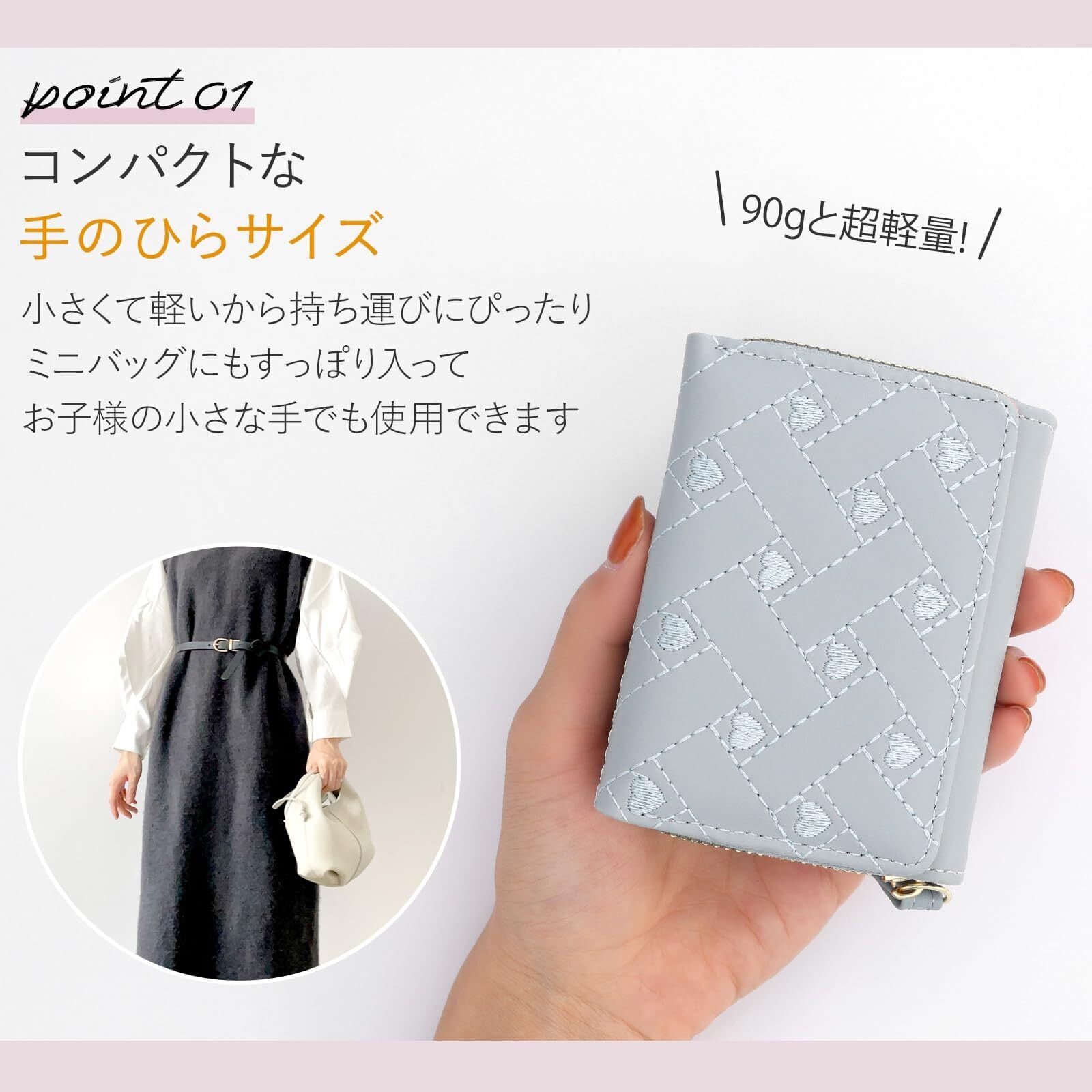 お子様も使いやすい手のひらサイズのコンパクトな三つ折り財布。 乙女心をくすぐる上品なハート柄の刺繍と内側ピンクのバイカラーが、大人っぽさと可愛らしさを両立しています。 スムーズに開け閉めできるなめらかなファスナーで大きく開く小銭入れ。開きやすく取り出しやすいゆとりあるお札入れ。 カードは7枚収納可能で、中央の窓付きポケットは定期入れにも、推しの写真を入れるスペースにもおすすめです