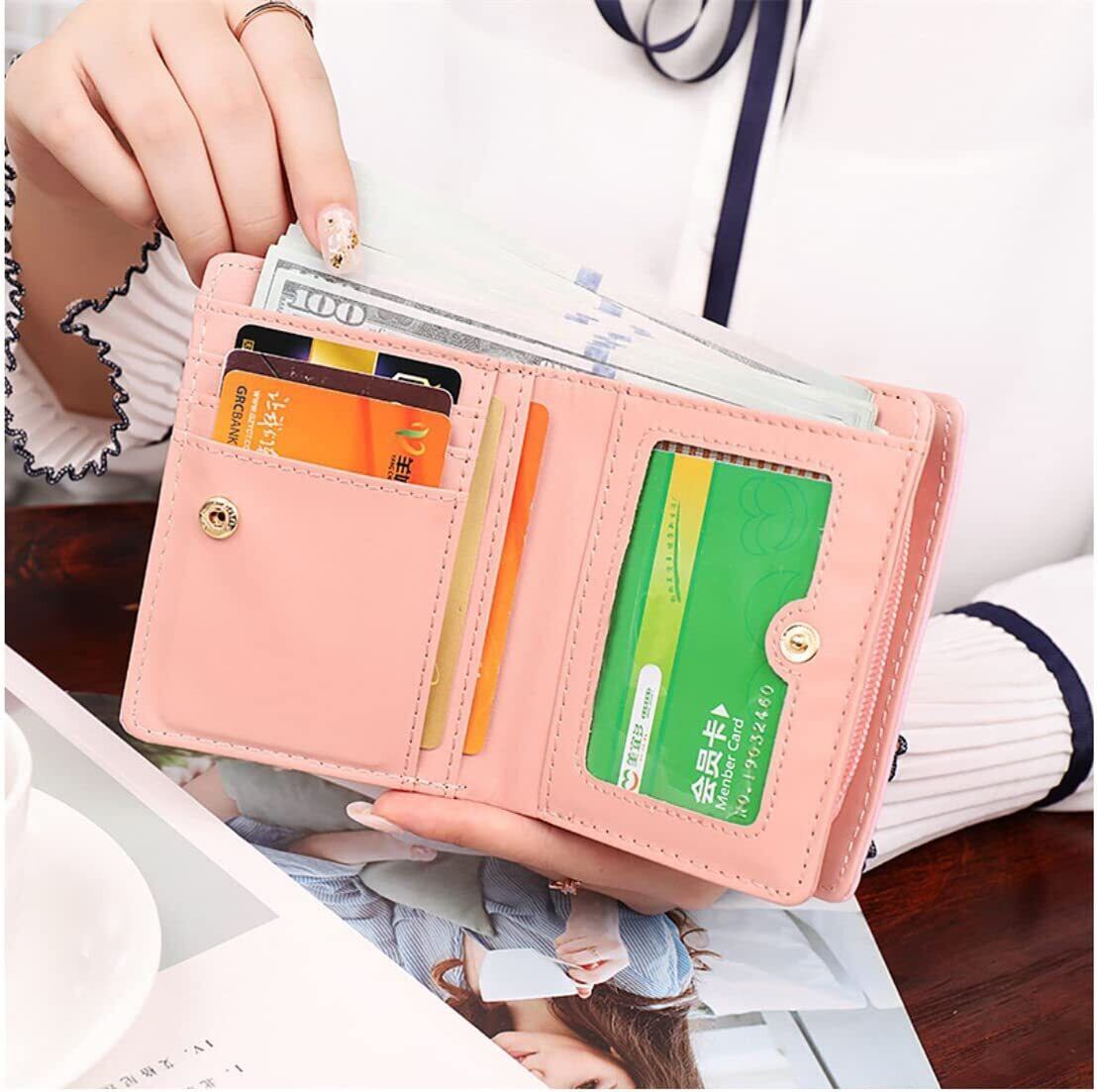大容量のミニウォレット:ボタン式+ラウンドファスナー。カード入れ×5、透明カード入れ×1、札入れ×1、仕切り小銭入れ×1。豊富なカードスロットとコンパートメントで、毎日のお出かけに必要な必需品を収納できます。