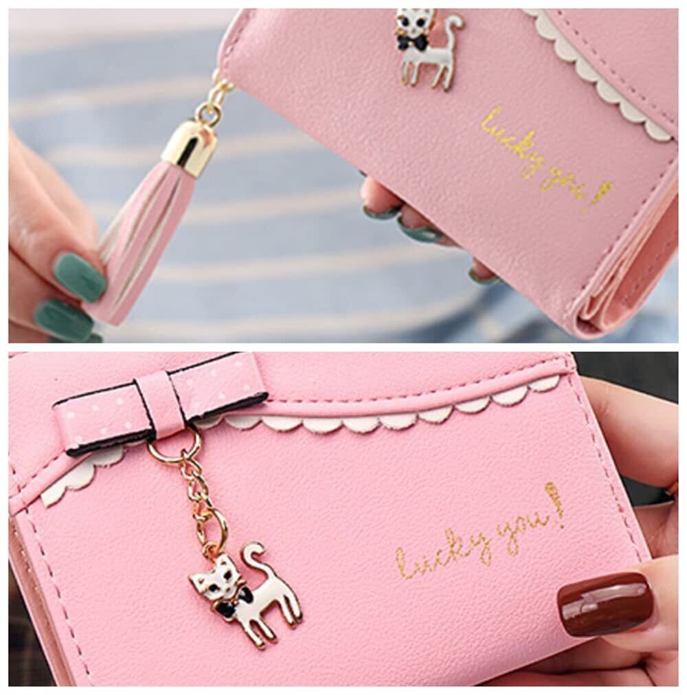 可愛い猫 財布:表地(PU)、裏地(ポリエステル/明るい色ストラップ内布)、横11cm×縦8cm×マチ2.5cm。精緻な蝶結びリボンと猫のチャームはおしゃれ可愛い感漂っている、財布ト同じ色タッセルも付くので、おしゃれたっぷり。また、おんなのこらしブルーやさしい雰囲気のパステル調はまるでマカロンみたい、見るたび笑顔がほころぶような愛らしくて、持っているだけで気分も明るくなり可愛くデコッて自分だけのオリジナル財布のできあがり!