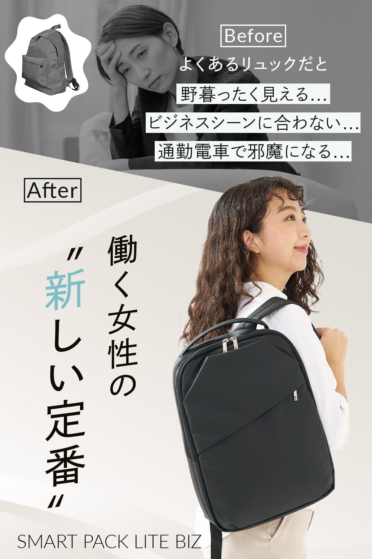 【女性に特化したビジネスリュック】洗練されたミニマルデザインと機能性を兼ね備えたビジネスリュック。肩紐と背面には通気性とクッション性に優れたメッシュ素材を採用。女性の体型にフィットする設計で、長時間の使用でも快適です。スマートな見た目は、商談でも好印象。