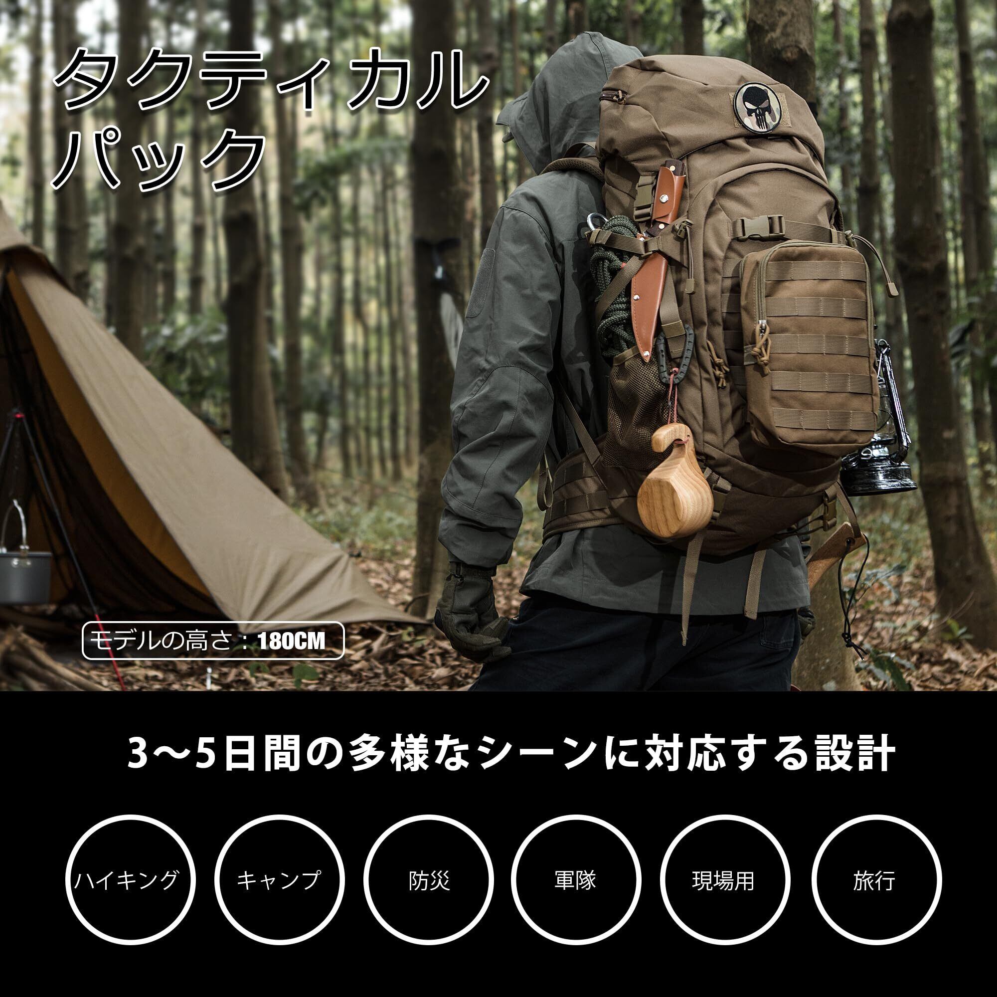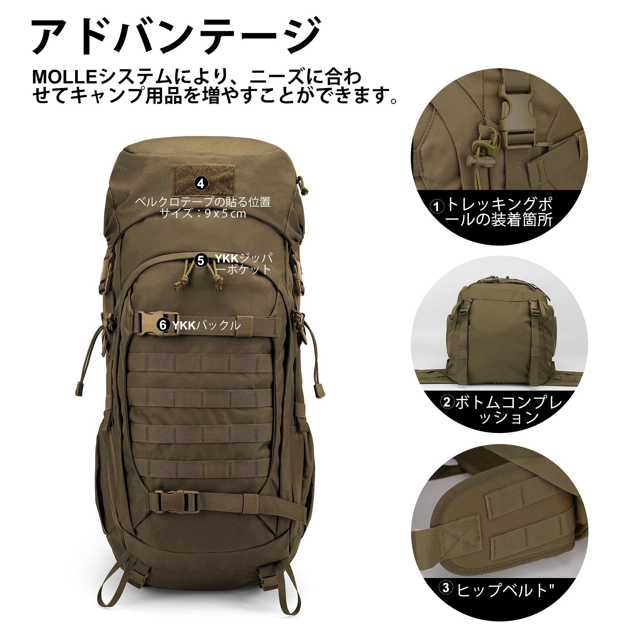 【防水性能】ミリタリーリュックサイズ:L29xH72xD23cm、容量:50リットル。生地は耐水性のある600Dポリエステル。耐摩耗性に優れ、長時間の使用でも色落ちしません。縫製は耐久性と通気性に優れています。レインカバー付き。