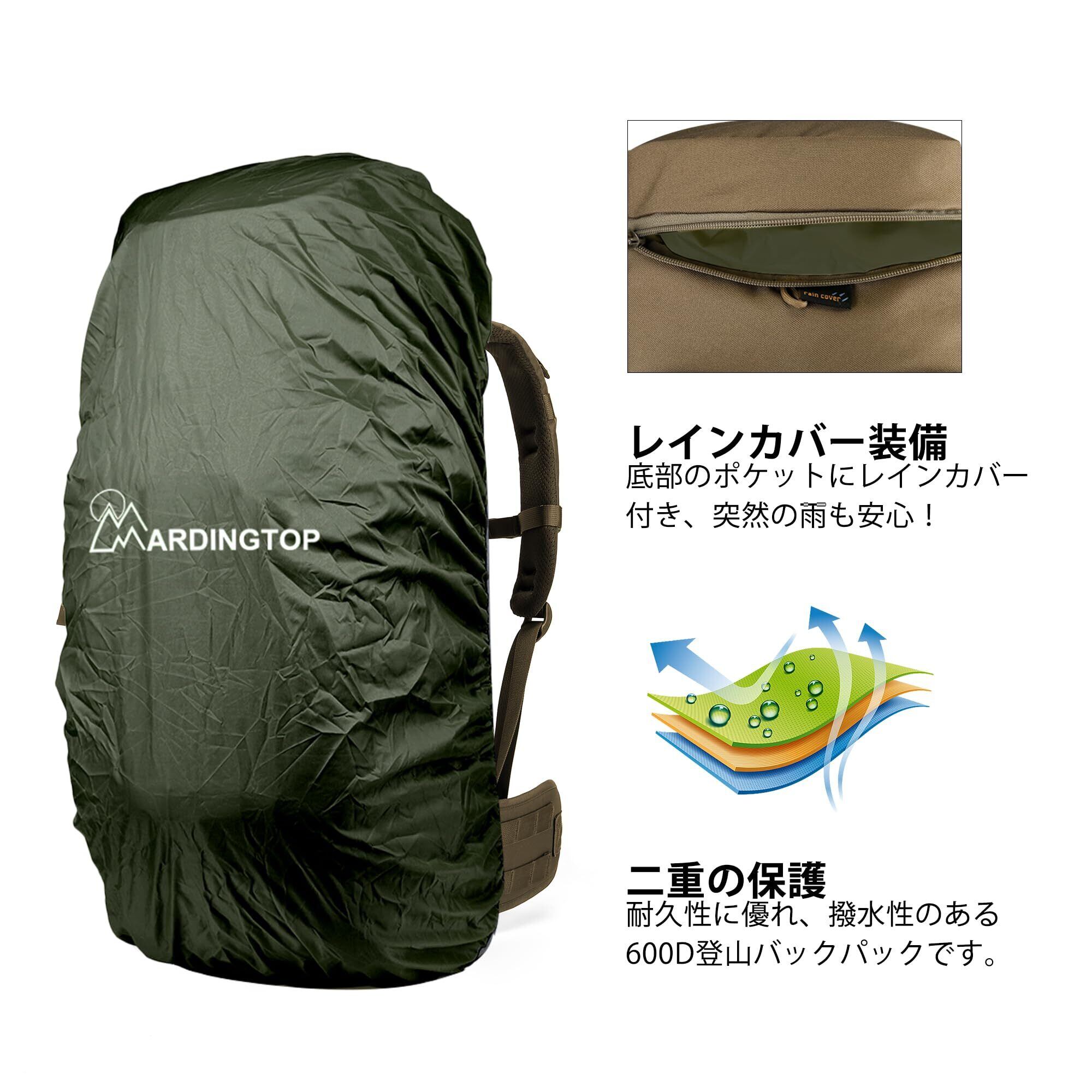 [Mardingtop] 50L バックパック 大容量 レインカバー付 タクティカルリュックサック キャンプ 登山 モールシステム ミリタリーリュック 軍用バッグ サバイバル トレッキング 大型 旅行 防災