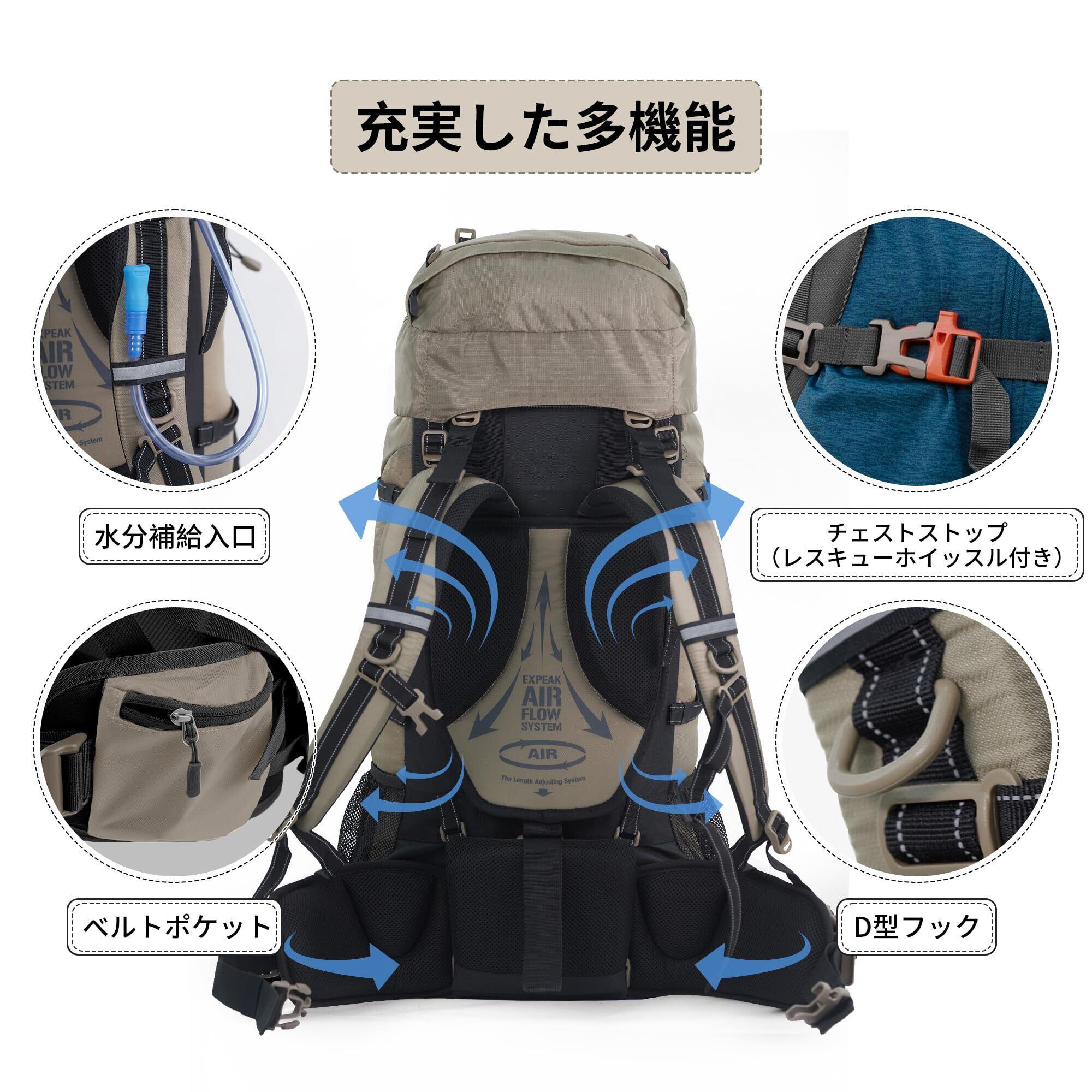 【大容量・耐荷重抜群】重さ:約1.87kg、縦75cmx横33cmx奥27cm。耐荷重:約14kg。登山、アウトドア、旅行、ボーイスカウト等に使える大容量70Lのバックパック。上部の収納空間を拡張したら、5Lの容量を増加できます。登山や旅行で使用しないときは防災セットを中にいれて、万が一の災害に対応できます。