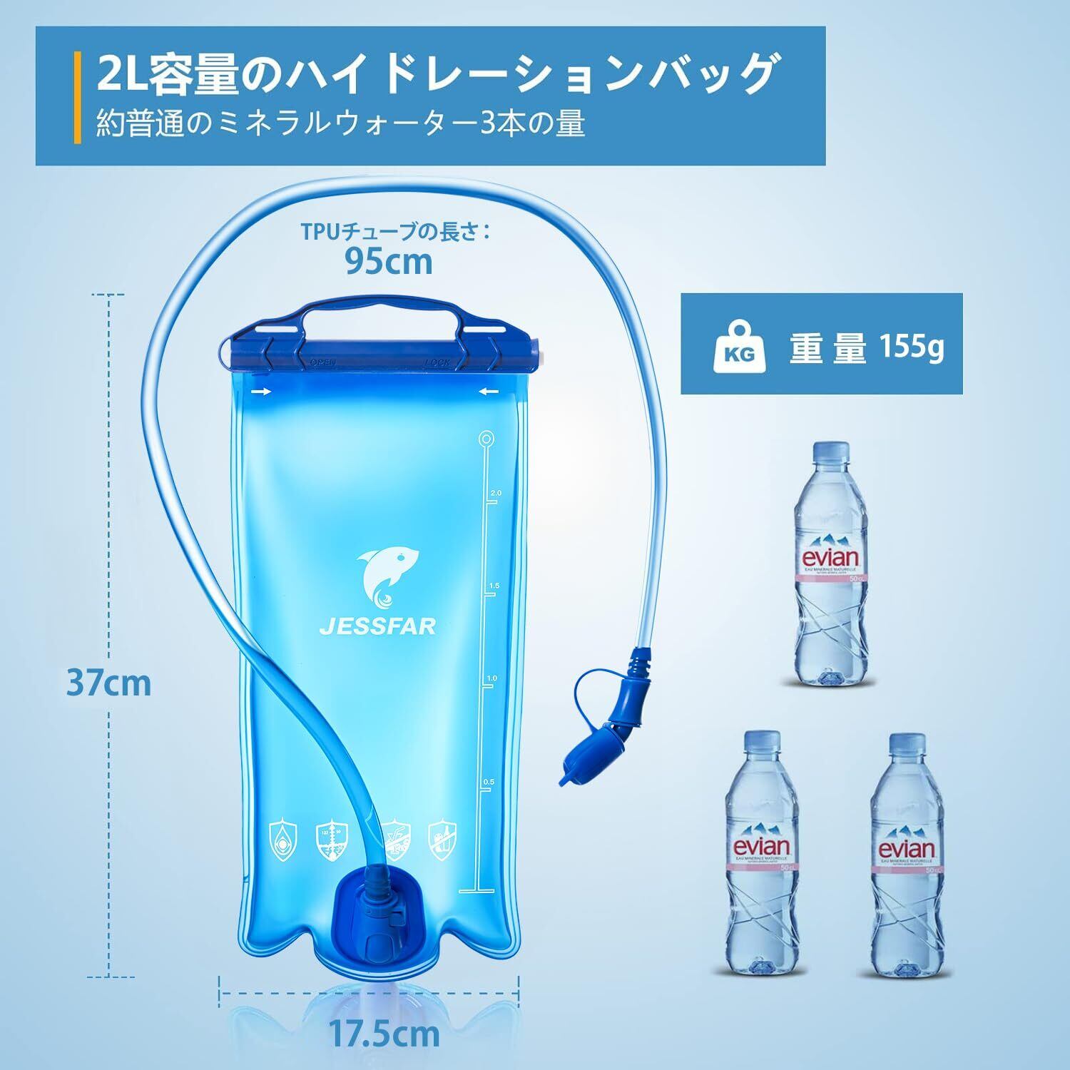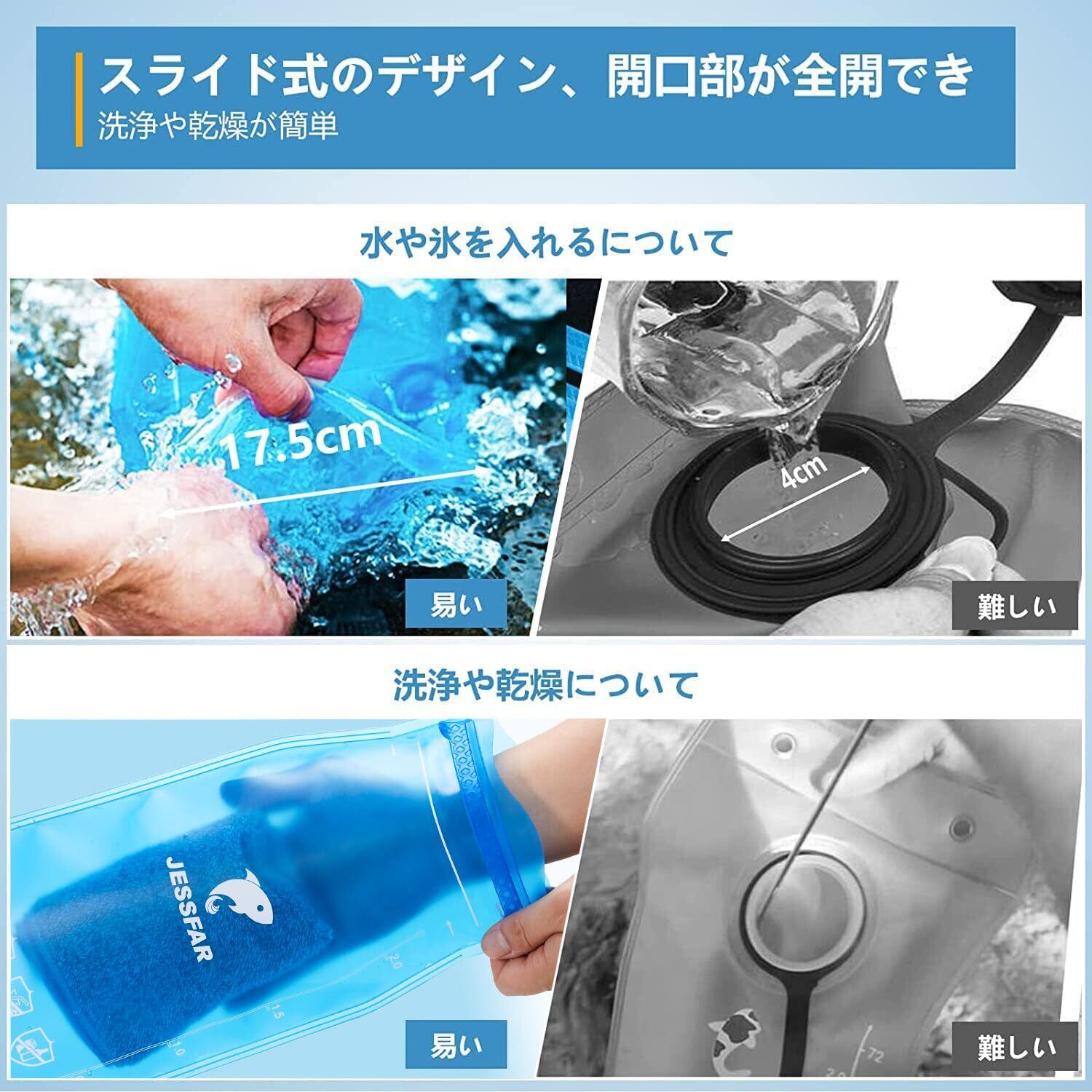 最新スライド式のデザイン、開口部が全開でき - Jessfarはお客様の声を聞き、「手が入らないので中が洗えない」「使用後も水分を拭き取っておくことができません」という欠点を完璧に解決しました。最新のハイドレーション水袋は上部にスライド式のデザイン、開口部が全開になるので、飲み物や氷を入れやすく、洗浄や乾燥もしやすくなりました。スライドでしっかり固定され、水漏れるの心配もありません。