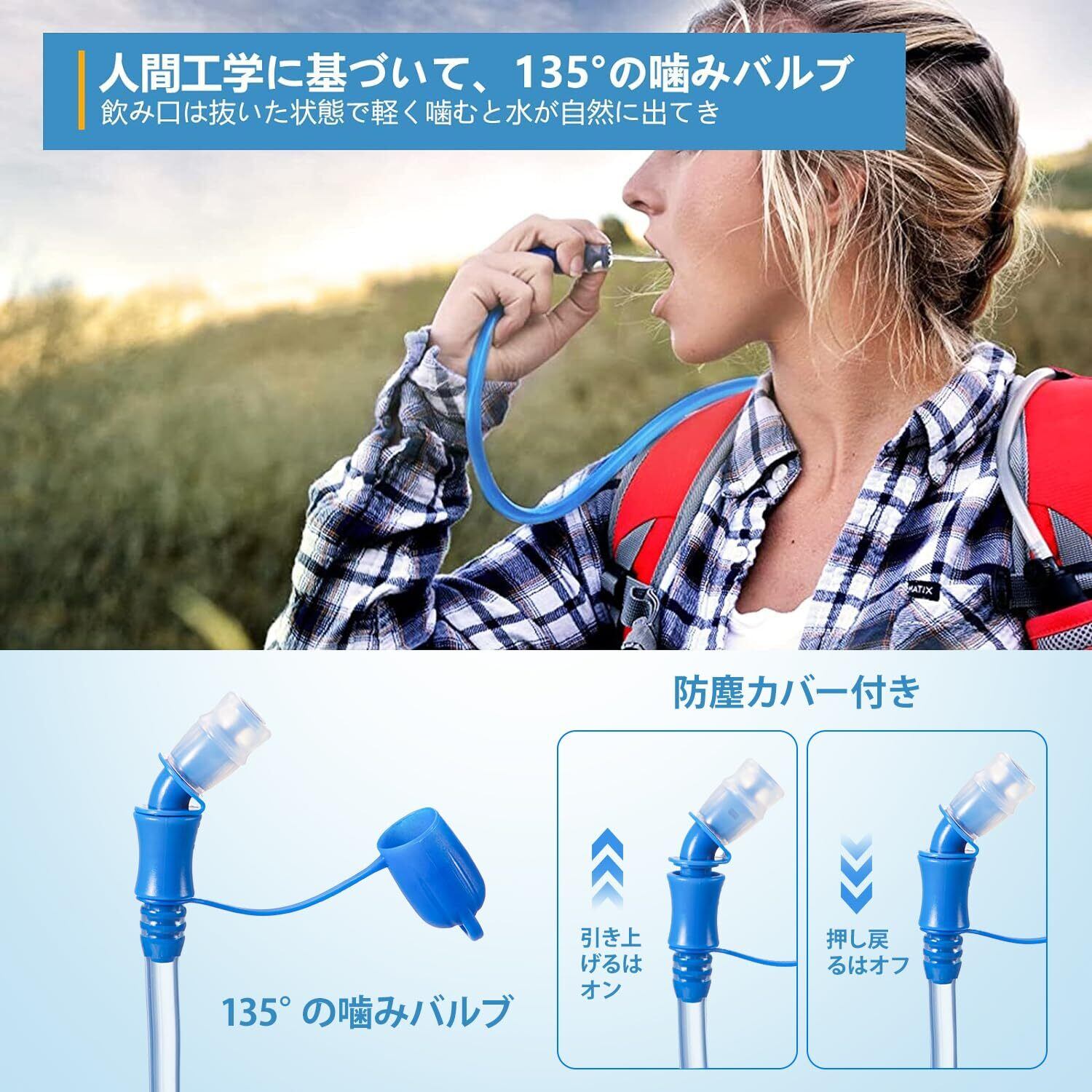 人間工学に基づいて、135°のバルブを改良 - 人間工学に基づいて、135°の噛みバルブを改良しており、使用の時チューブの部分はより小さい角度で、飲み易いです。飲み口は抜いた状態で軽く噛む吸いと水が出てき、両手を使わずに快適に給水ができます。飲み口の汚れを防ぐには、飲み口に防塵カバーが付きます。