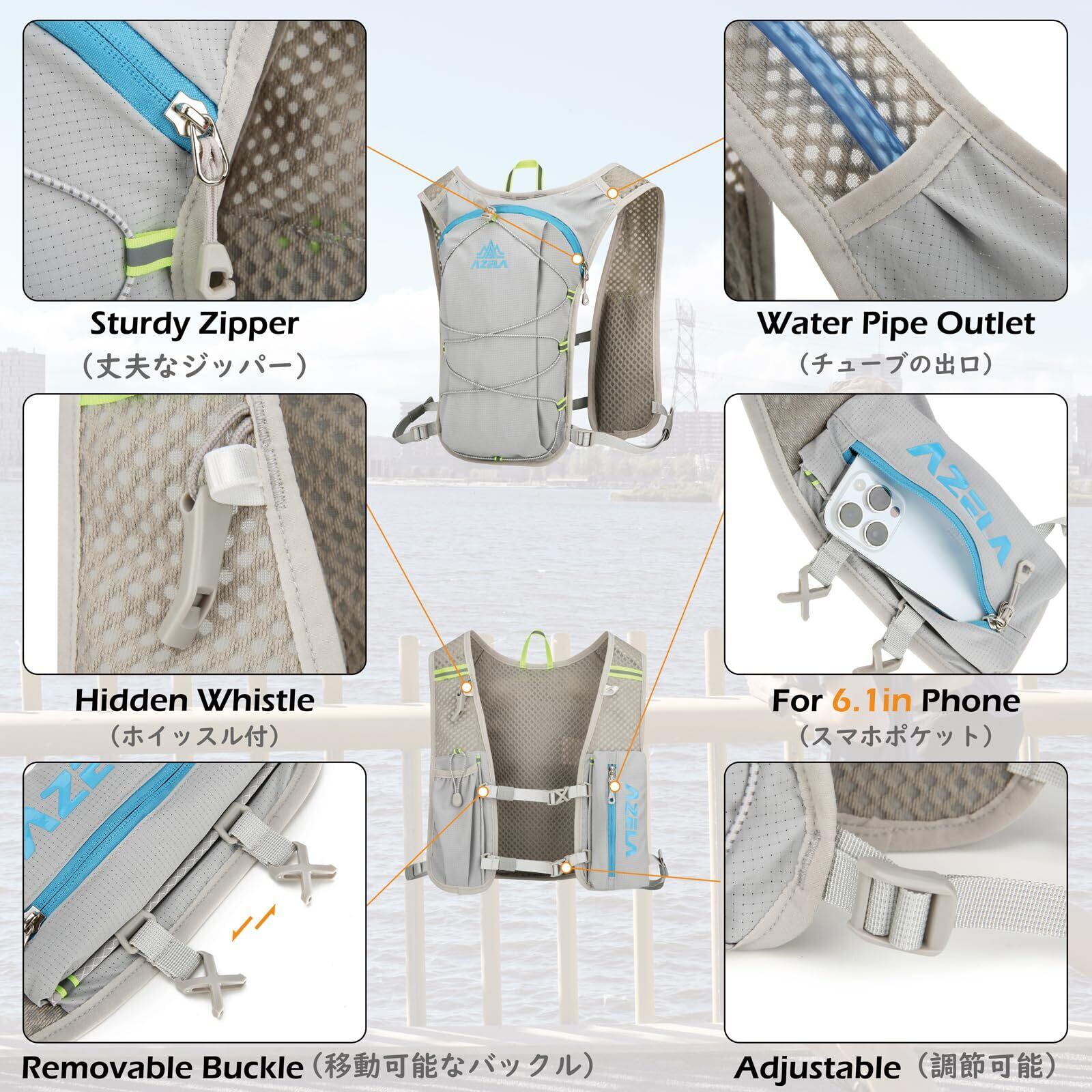 【小物から給水パックまで収納可能】前面のポケットにはスマホや補給食、ボトルなどを、背面には1.5Lハイドレーションやタオルなども収納可能。必要なものをスッキリ整理できます