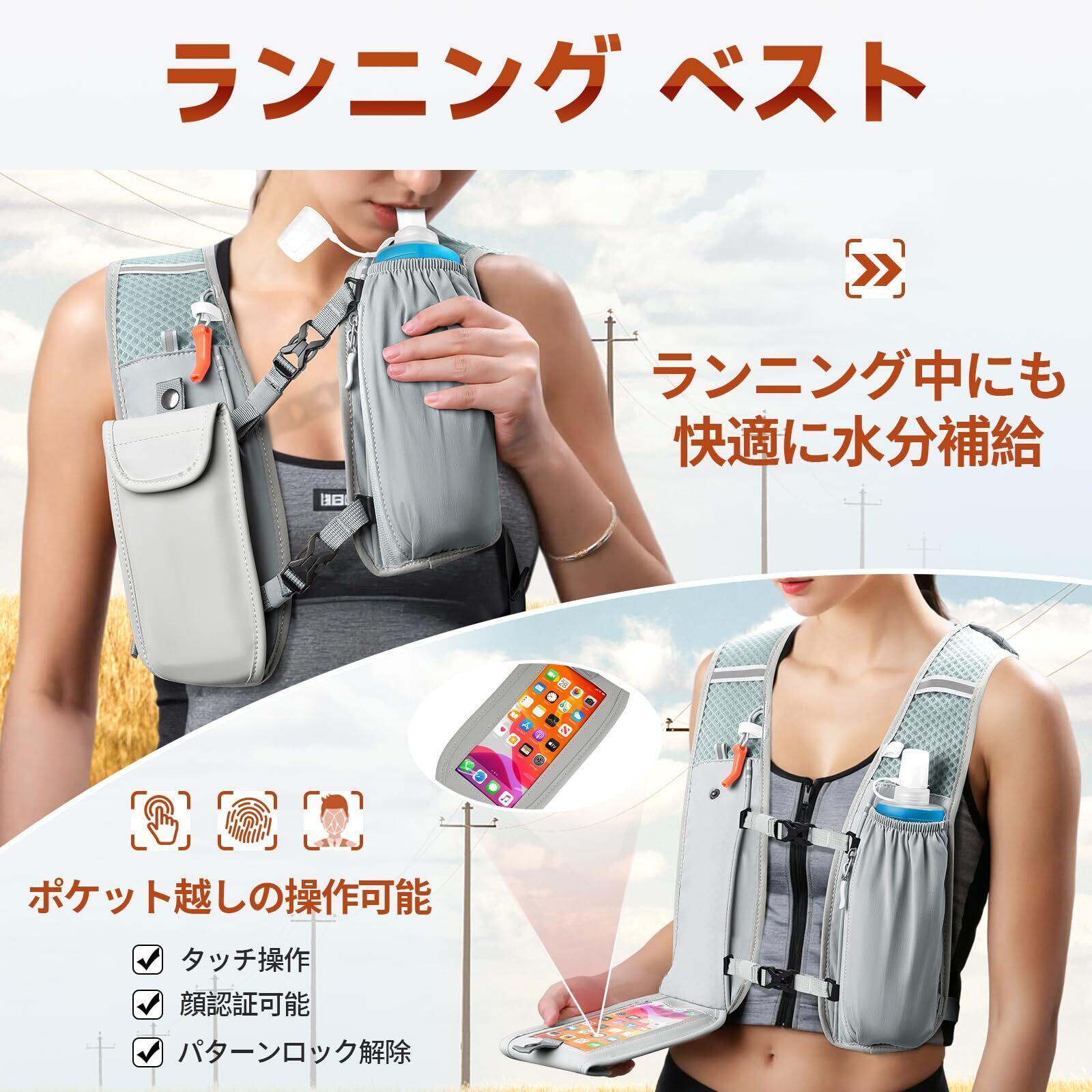 実用的な設計:このランニングリュックのショルダーには透明で防水スマホポケットを装備、ポケット越しにタッチ操作/顔認証/パターンロック解除が可能で、取り出さずに電話応答やメッセージ返信もできます。また、背面には調節可能な弾力紐付き、タオルなどの小物を収納でき、すぐに取り出すできます。さらに、このランニングリュックには500mlの折りたたみ式ハイドレーションボトルが付属しており、BPA・PVCフリー、無臭無味です。使いやすい設計で、いつでも手軽に水分補給が可能です。