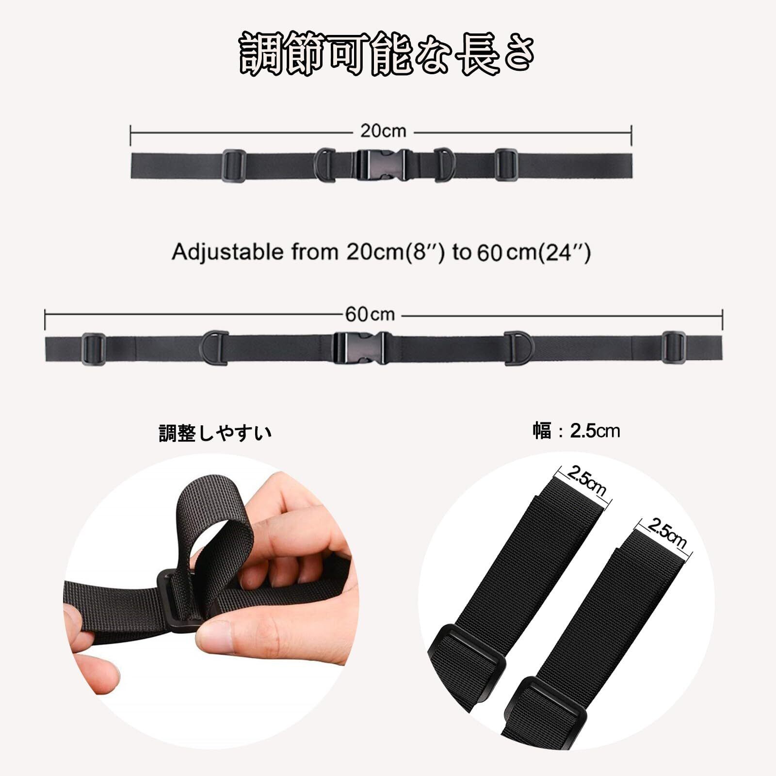 【商品詳細】: このバックパック/リュック用バンドは、20cm から 60cm まで調節可能で、幅広い体型に対応しています。また、2.5cm のベルト幅が快適な着用感を提供します。双肩包を着用する際に、肩からの滑落や背中への負担を軽減することができます。さらに、コンパクトなサイズで収納も簡単なため、旅行やアウトドアなどにも最適です。このバックパックストラップを使うことで、双肩包をより快適に着用し、身体への負担を軽減することができます。