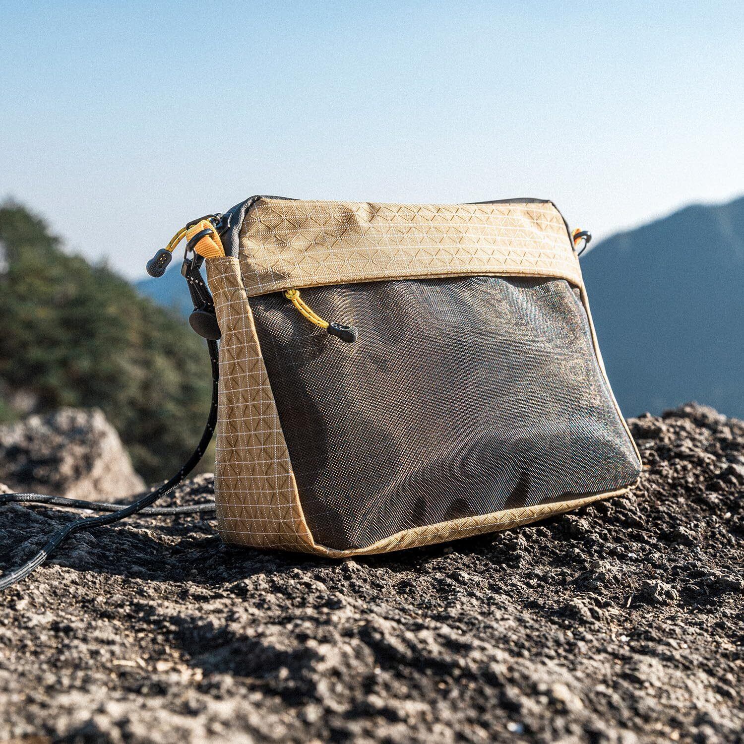 シンプルで洗練されたデザイン:素材選びには徹底的にこだわりました。アウトドアで使うためには水にも強く、強度があり、軽量なダイニーマとナイロン混紡素材を採用しています。本体の表側に大きいメッシュポケットを配置し、また、本体内部には仕切りも設けられていて、小物類を分けて収納できます。