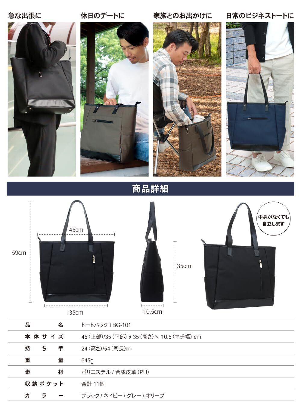 【圧倒的な軽さ645gの軽量トートバッグ】手に取った瞬間に感じるのは、その軽さ。わずか645gという重さは、通勤や外出時の負担をぐっと減らし、毎日持ち歩いても疲れにくいのが特徴です。素材には軽さとタフさを両立したポリエステルを採用。見た目に反してしっかりとした作りなので、気兼ねなく日常使いできます。