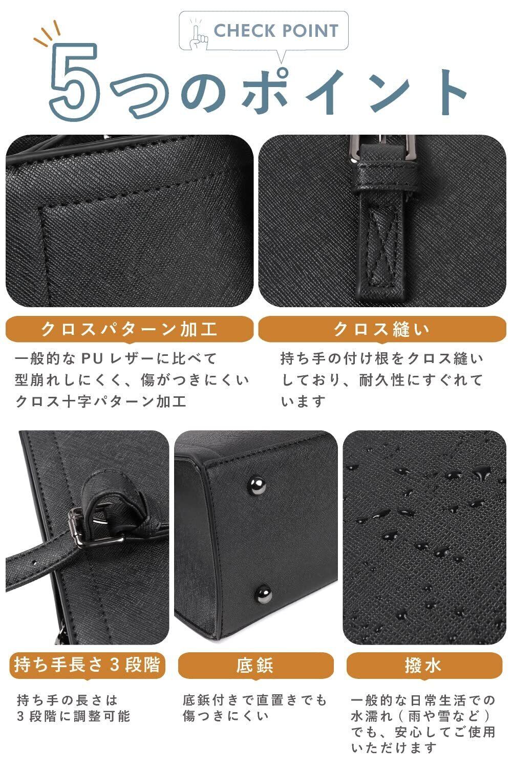 【機能面も充実】ペットボトル 水筒などをホールドできるドリンクホルダー付き、防犯面やプライバシー面を考慮した天面ファスナー、直置きでも傷や汚れからバッグを守る底面に鋲付き、一般的なPUレザーに比べて傷が付きにくく型崩れやシワになりにくいクロス(十字)パターン加工、一般的に日常で生活する際の水濡れなどなら守る防水加工、3段階に調整可能な持ち手。収納しやすい3つに分かれた収納スペース。