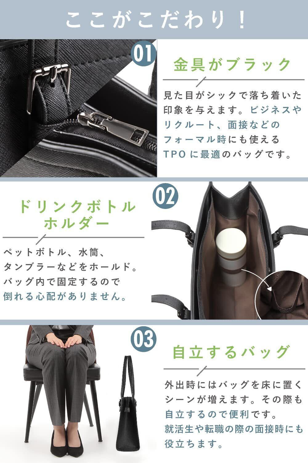 [Miwoluna] [ミウォルナ] ビジネスバッグ リクルートバッグ 就活 トートバッグ A4 ドリンクホルダー ブラック レディース