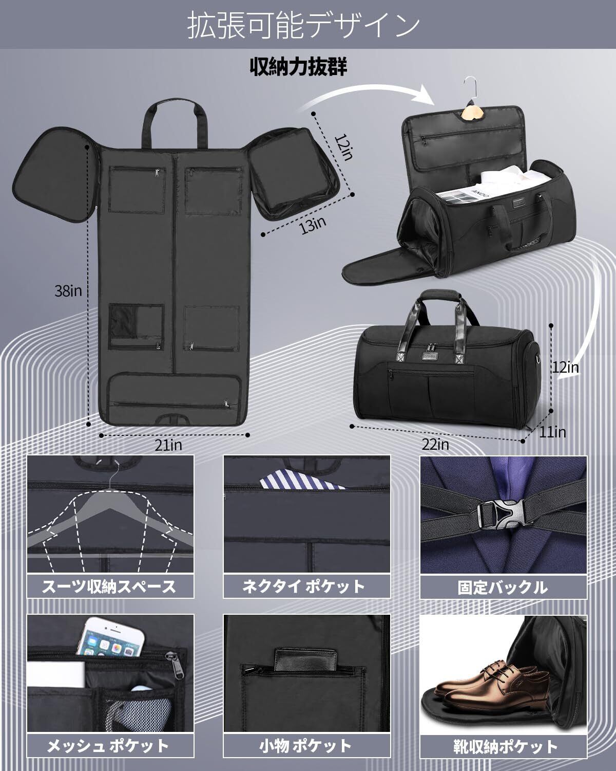 [HOMIEE] ガーメントバッグ 乾湿分離 スーツ収納/靴収納 メンズ/レディース ビジネスバッグ ボストンバッグ 45L 大容量 3WAY スーツバッグ 機内持ち込み 型くずれ防止 3泊4泊 シューズ 折り畳み 出張/旅行など