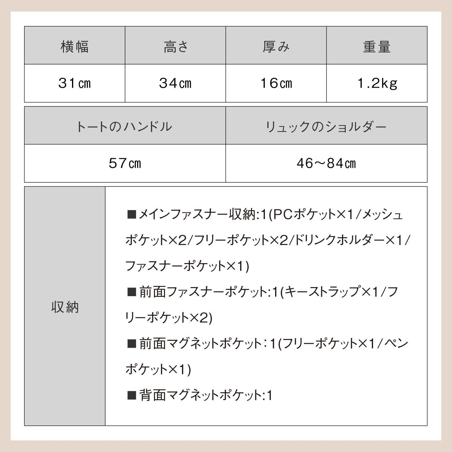 【シーンに合わせてトートバッグ・リュックサックとして使用できる2WAY】リュックベルトをトートバッグ本体に内蔵しており、リュックとしてもご使用頂けます。 また使用しないリュックベルト・トートバッグ用持ち手はポケットに収納可能。【傷・水・汚れに強いPU(合成皮革)】天然皮革に似た質感や風合いを持ちながら傷・水・汚れに強いPU(合成皮革)を採用。 表面は高級感のあるサフィアーノ調を採用しており、きれいめバッグはビジネスシーンにピッタリです。