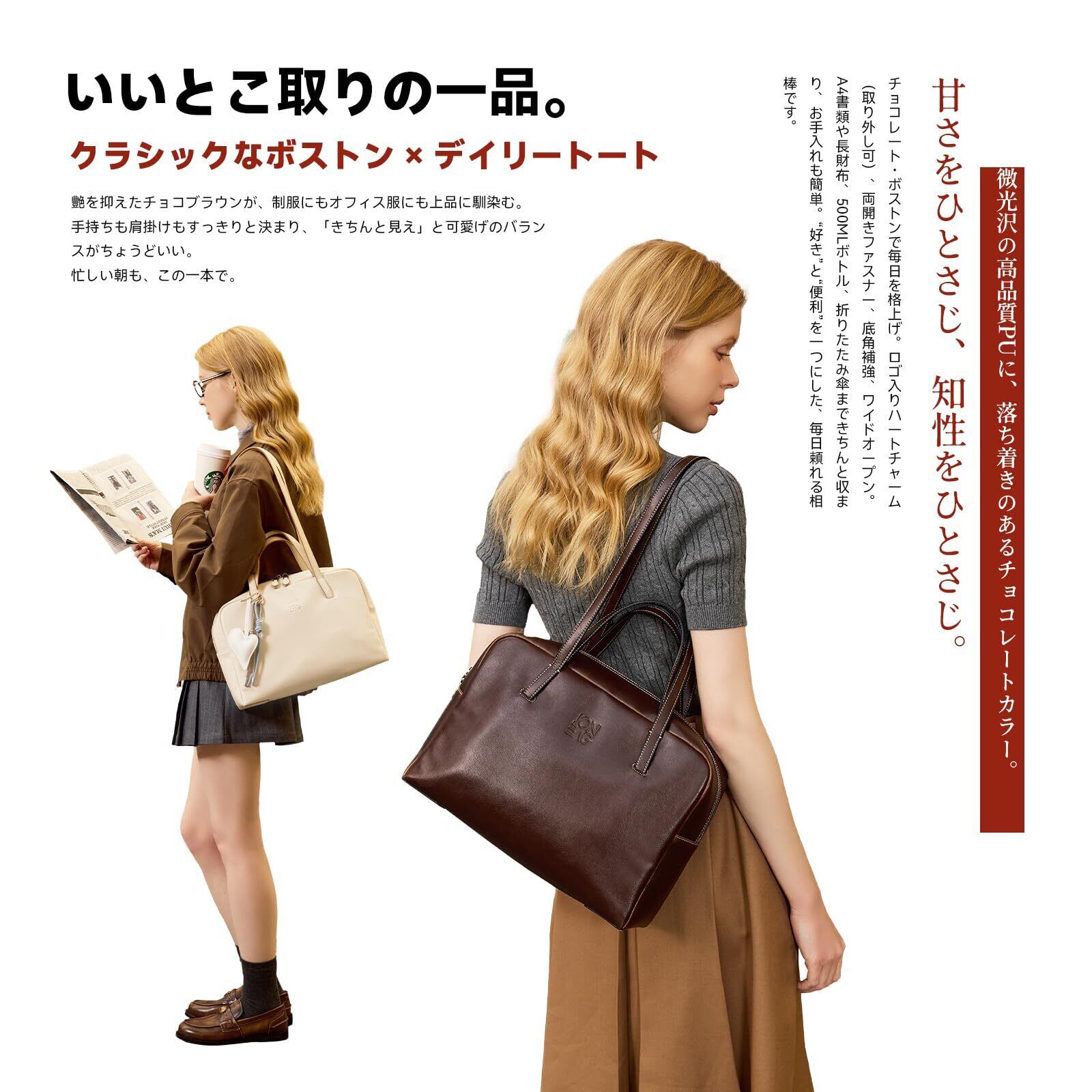 ① デザイン・印象(外観) 今日の気分にちょうどいい。上品さと抜け感を両立するボストンデザイン。 かっちりしすぎず、カジュアルすぎない。コーデにさりげなく“大人の余裕”を添えてくれる、ヴィンテージ調レザー風のシルエット。 甘すぎず、強すぎない、絶妙な存在感が魅力。 同シリーズのトートやブリーフケース、リュック、バケットバッグとも相性抜群で、スタイルに合わせて使い分けが楽しめます