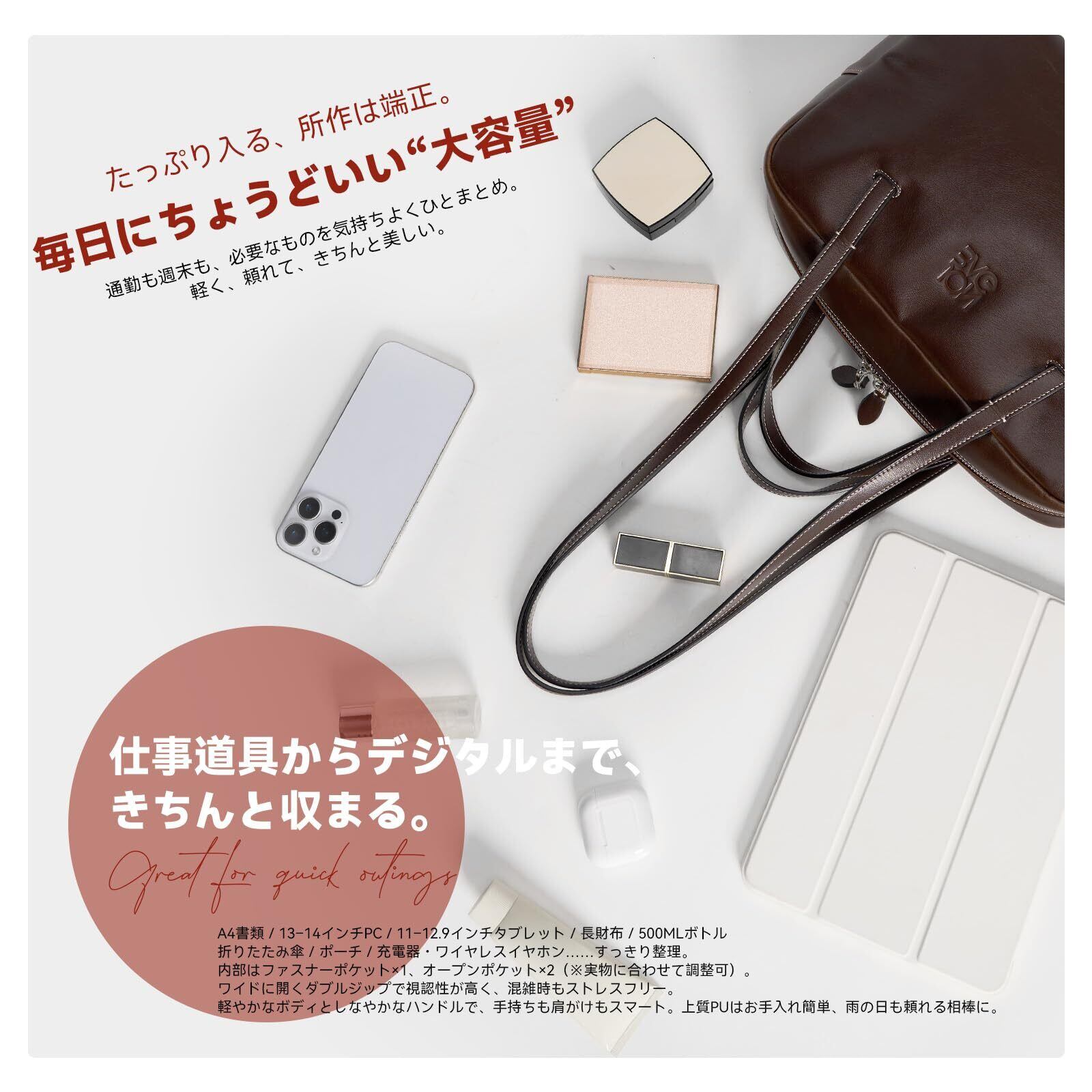 収納力(容量・実用性) 見た目以上の収納力。A4書類も余裕で入るボリューム感。 ノートパソコンや書類、コスメポーチ、折り畳み傘まで。オンでもオフでも荷物の多い日をスマートに支える。 整理しやすく、毎日使いたくなる頼れる収納力。