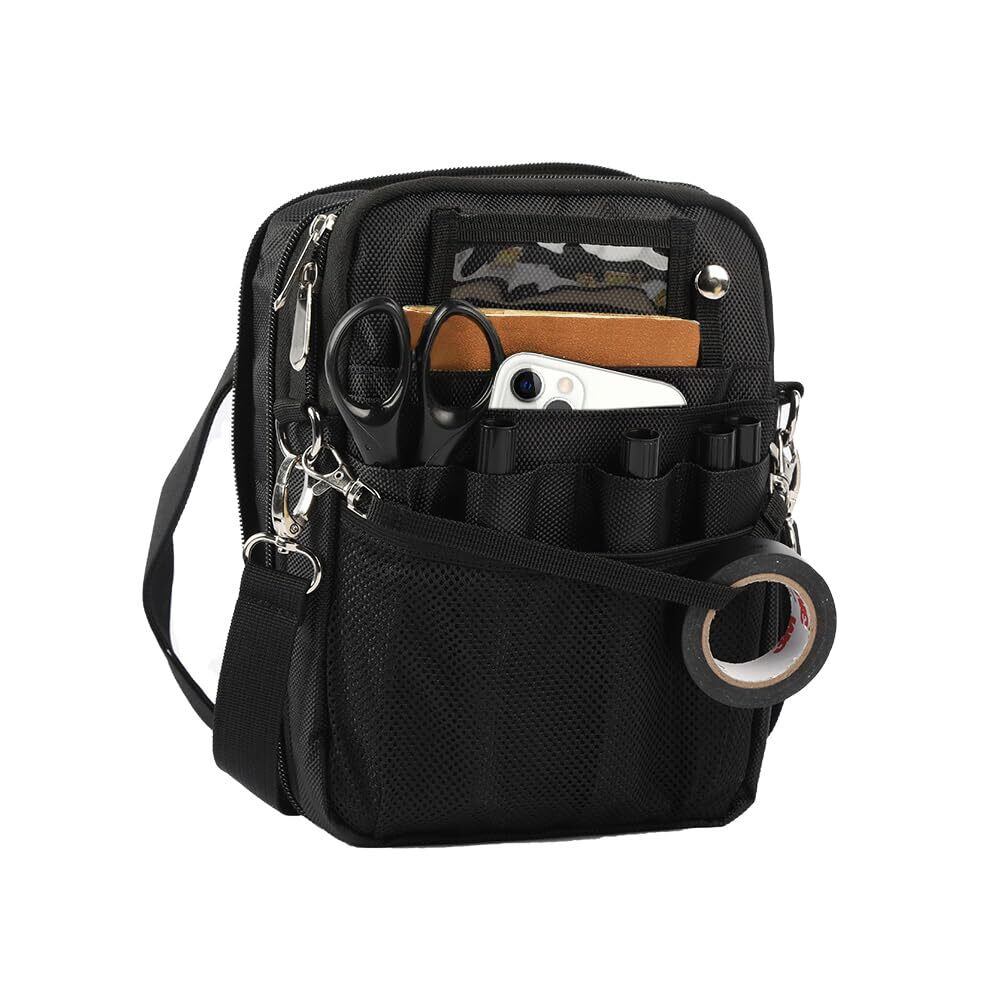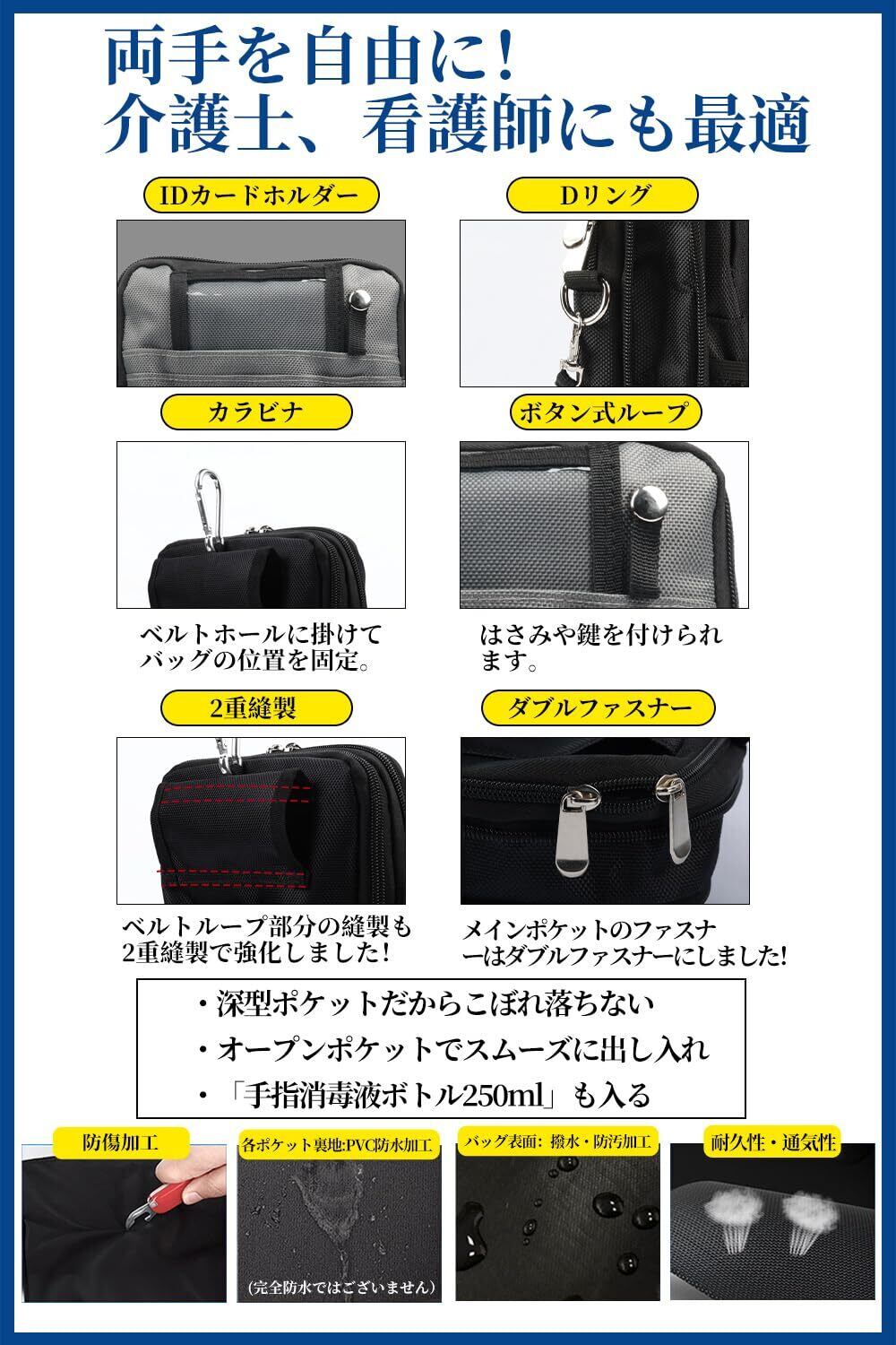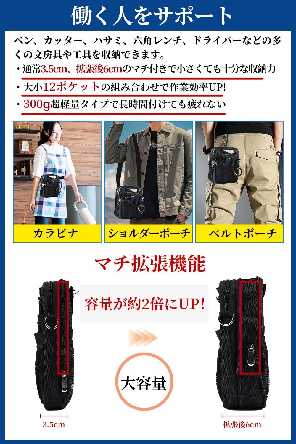 [CARRY ALL BEFORE ONE] 多機能 ナースポーチ ウエストバッグ マチ拡張可能 ダブルジッパー 3way ショルダー マチ付き 文具 工具バッグ 作業用 業務用 看護 介護 事務 ベルト付き 撥水 防傷 12ポケット Mサイズ ブラック